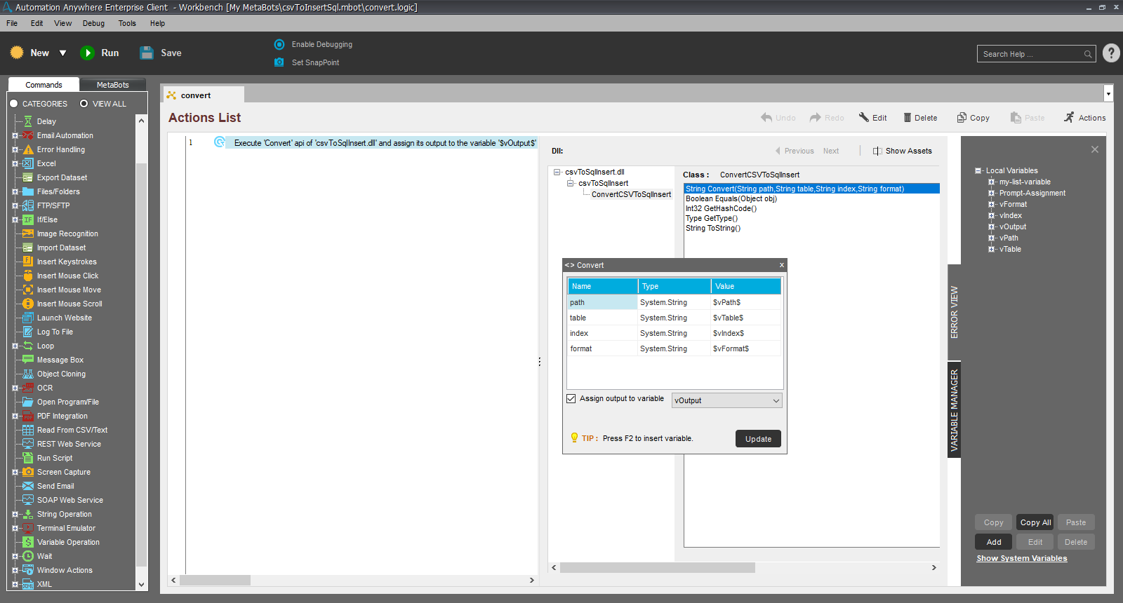 This bot reads a CSV file and returns a SQL insert statement using a given table name with the content of a given CSV column index and format the data given a pre-determinate format. Where the inputs path, table name, and format are strings, the column is an integer and the output is a string.