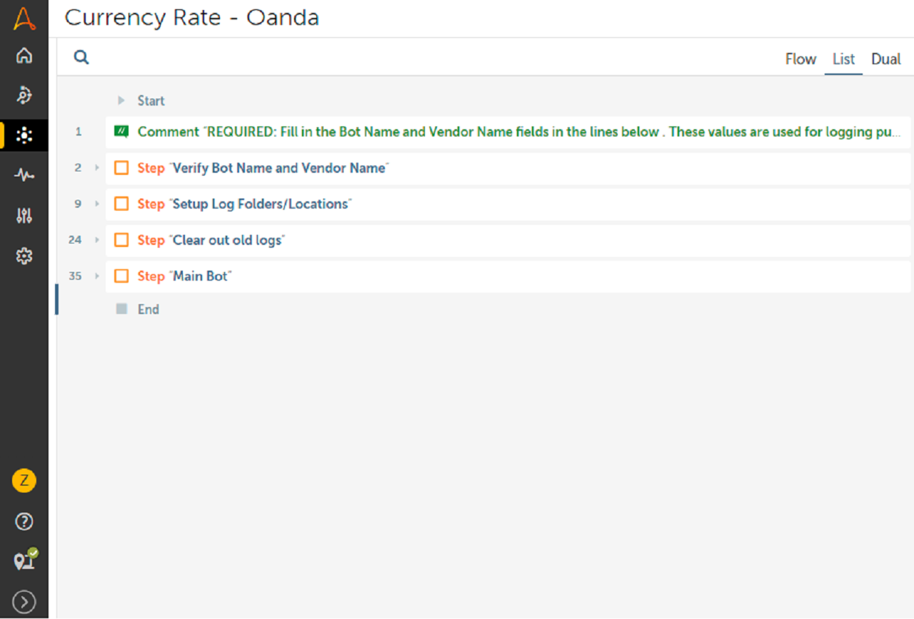 Actions: The bot reads the Excel file which contains data points like Country codes for which the bot will extract the Exchange rate. The bot will take the Country code in a variable and open the Oanda Portal to extract the exchange rate. The bot will select the Country code from the dropdown in the Oanda Portal with respect to the Country code present in the Excel file one row at a time. The bot will then extract the exchange rate of the Country code entered.