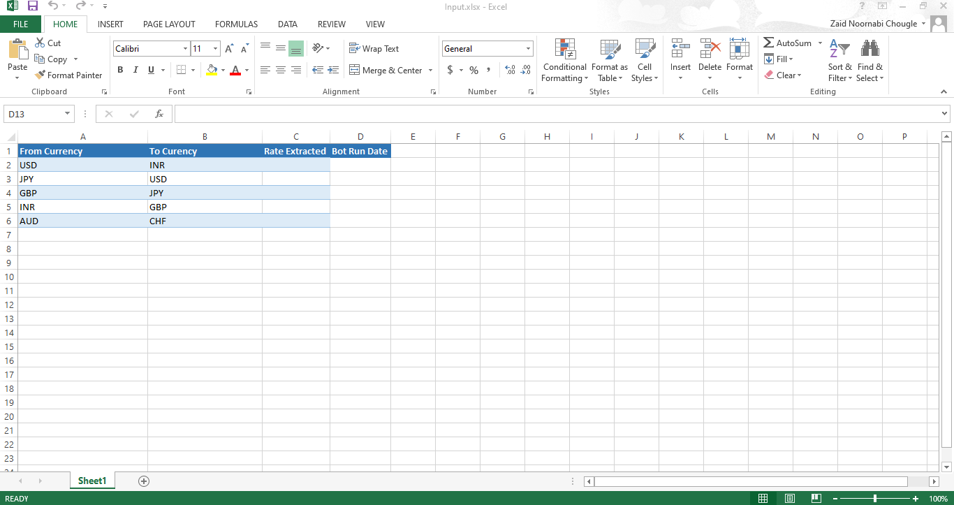 Inputs: Excel File is present in the control room which will act as an Input file.