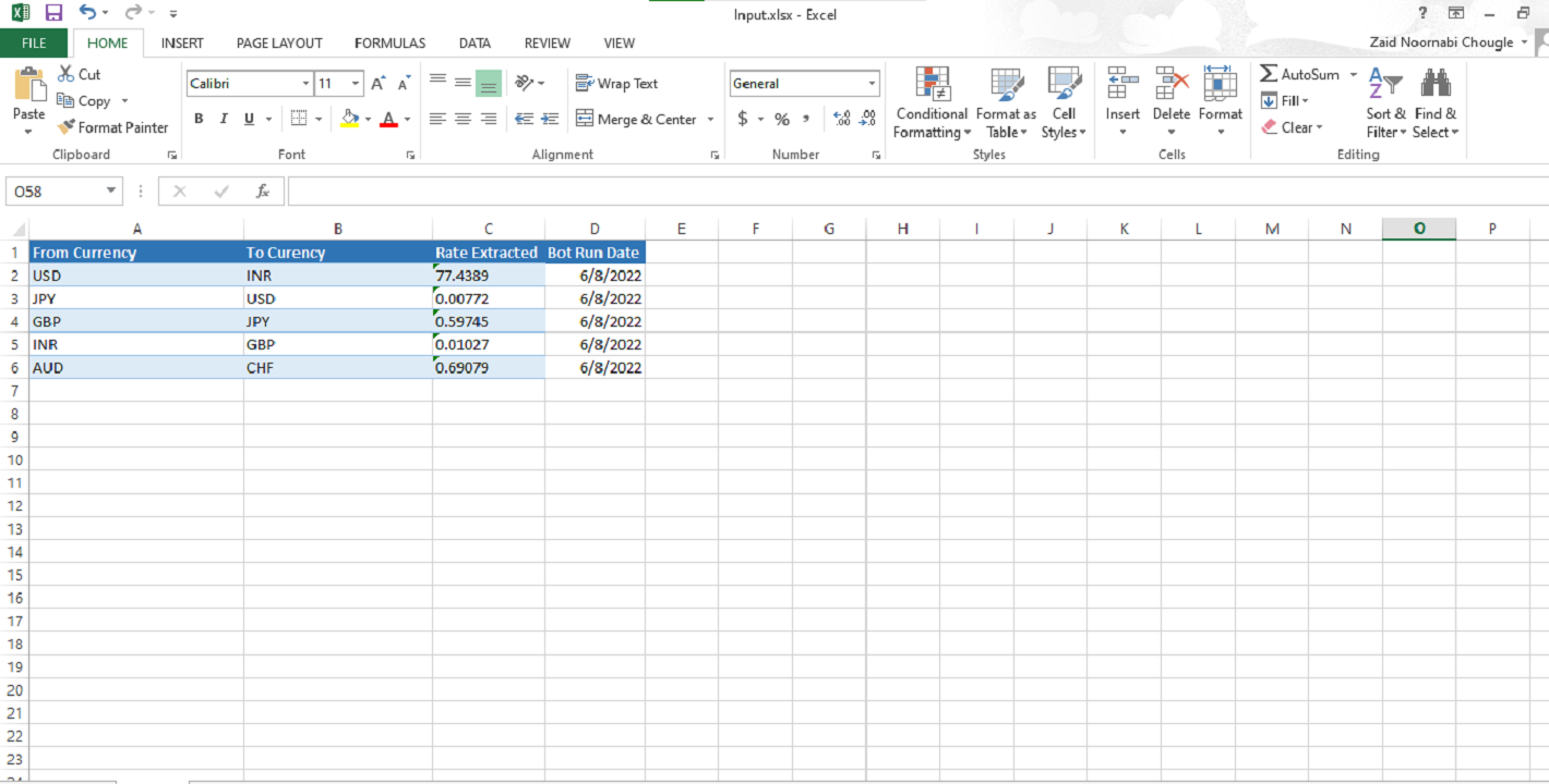 Output: The bot will set the rate extracted from Oanda and set it onto Excel along with today's date.