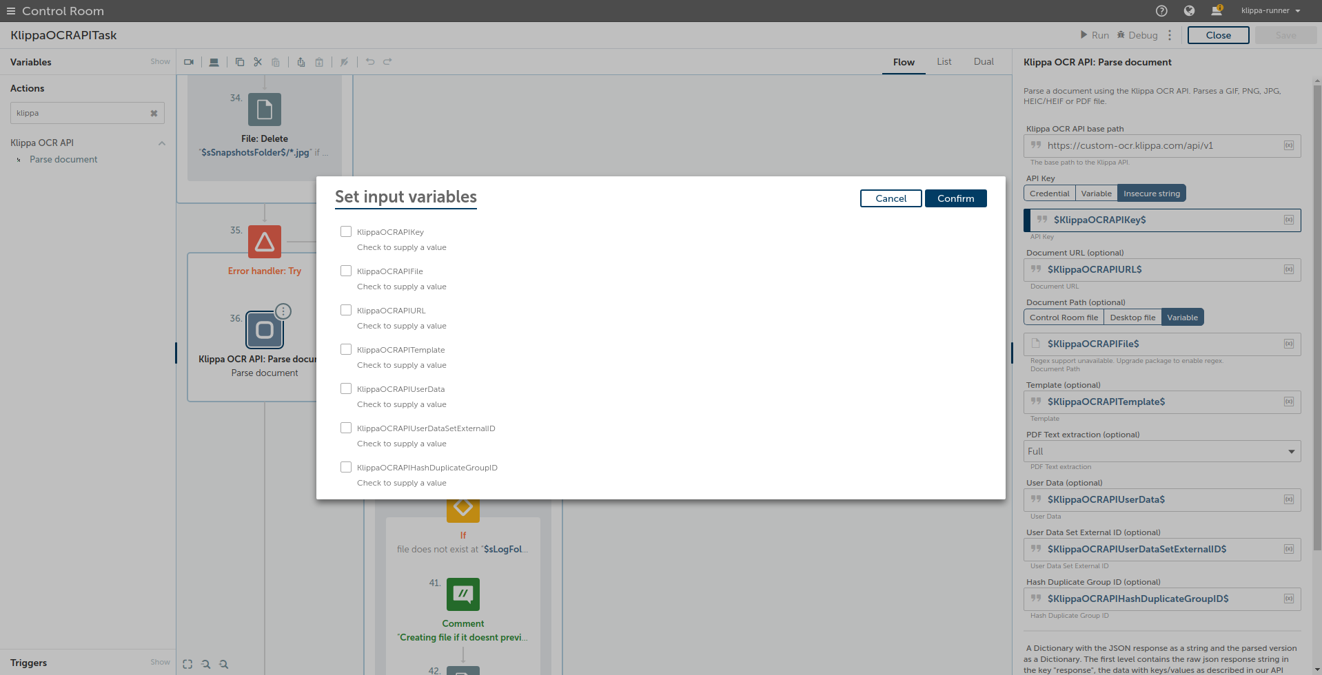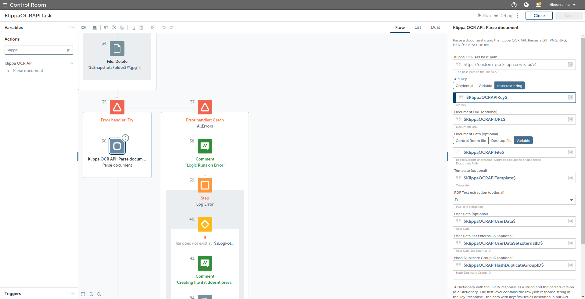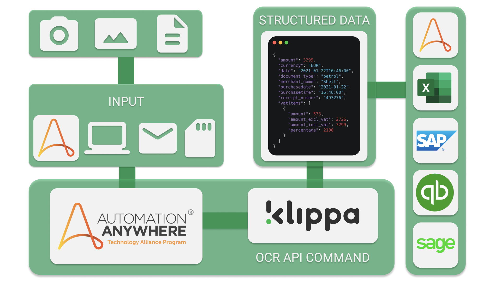 The Klippa OCR API Package can be used to automatically extract data from receipts, invoices, passports, and other documents, and utilize this data in subsequent steps in Automation Anywhere. It is also possible to pass the data on to other file formats, such as Excel or CSV, for further analysis.
