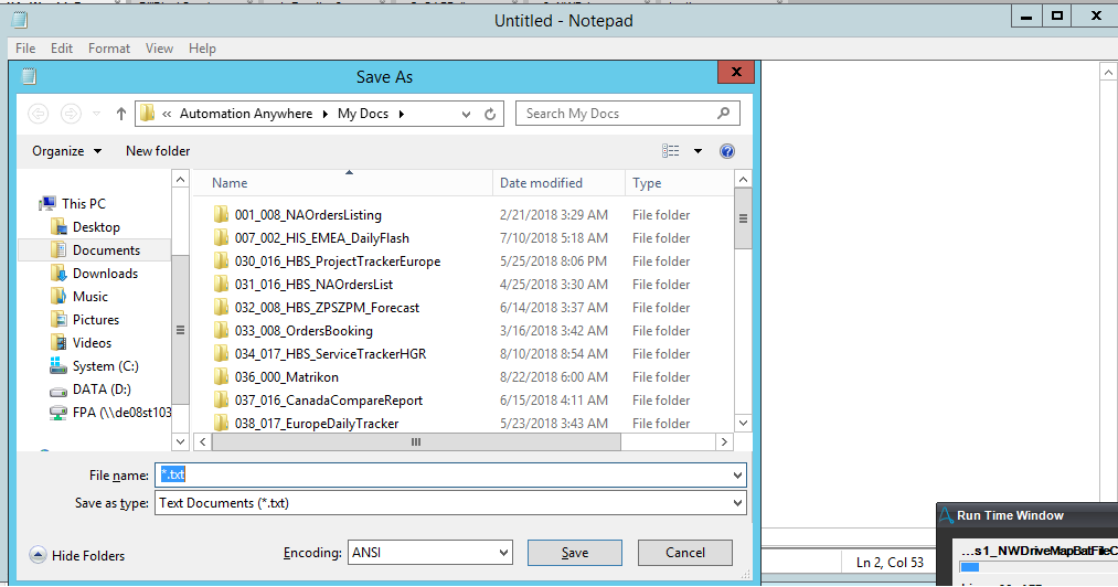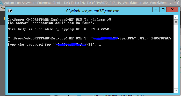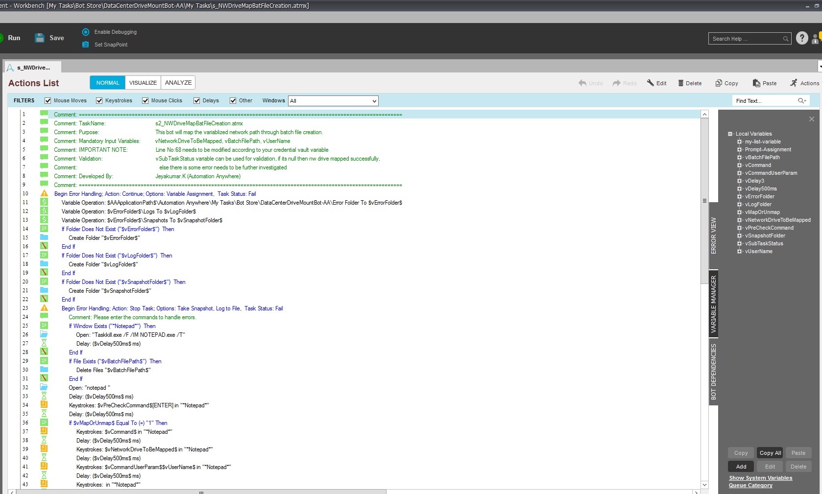 This bot is used to mount the data center's shared folder as local drive. The same bot can also be used to unmount the mapped drive. The bot needs one line modification for accessing the password from credential vault (Line Number 70).