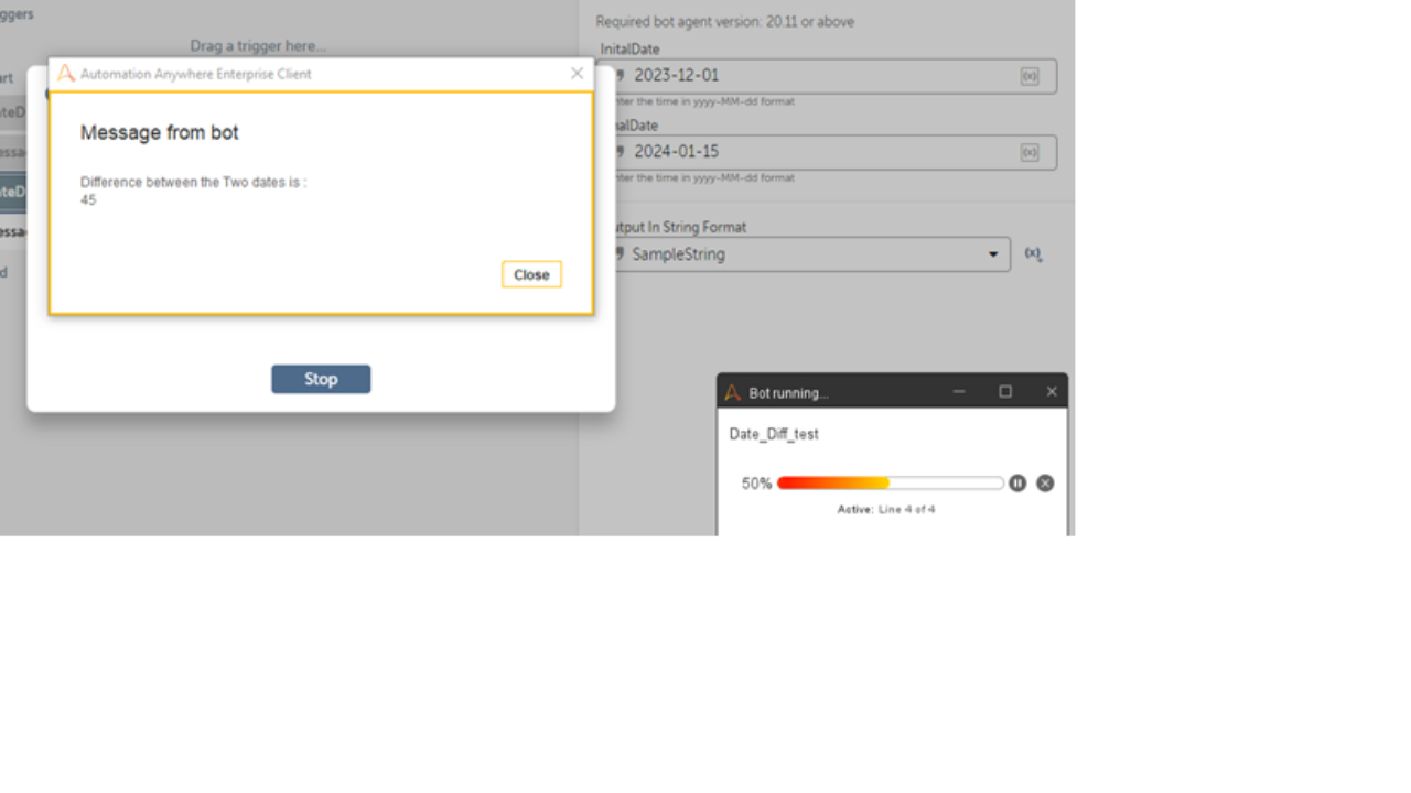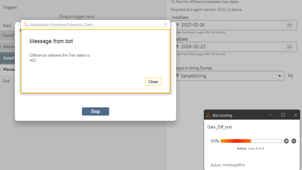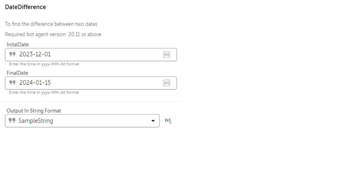 The bot takes 2 inputs: * InitialDate (yyyy-MM-dd) * FinalDate (yyyy-MM-dd) and returns the Days between as a String value