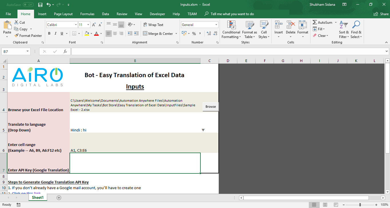 - Inputs: All the Inputs are provided through Inputs.xlsm file.- Browse your Excel File Location - Select Target Language (Drop Down)- Enter cell range (Example -- A6, B9, A6:F12 etc)- Enter API Key (Google Translation)