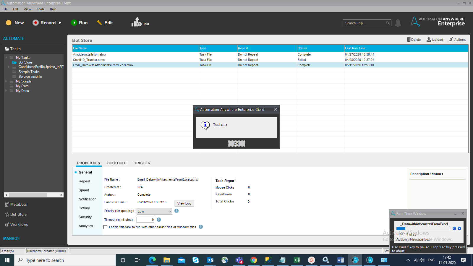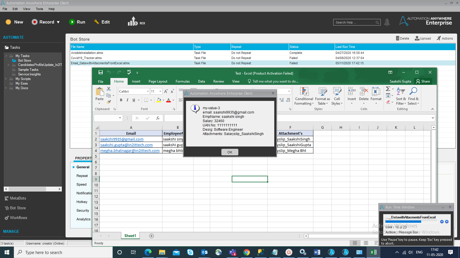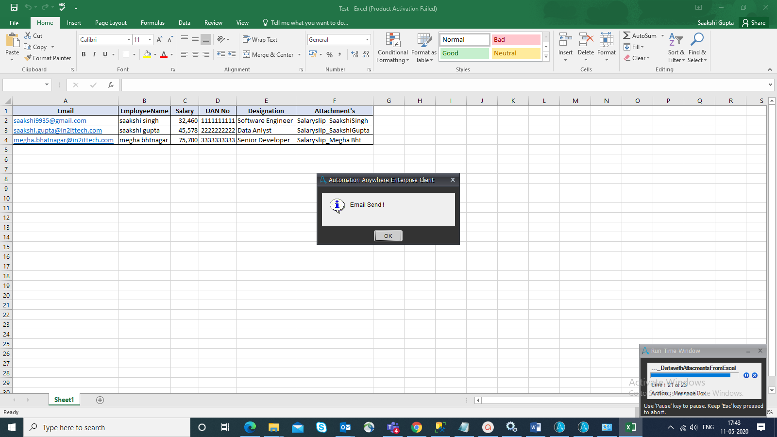Bot will open and read the Excel data and send all the details with attachment on mail.