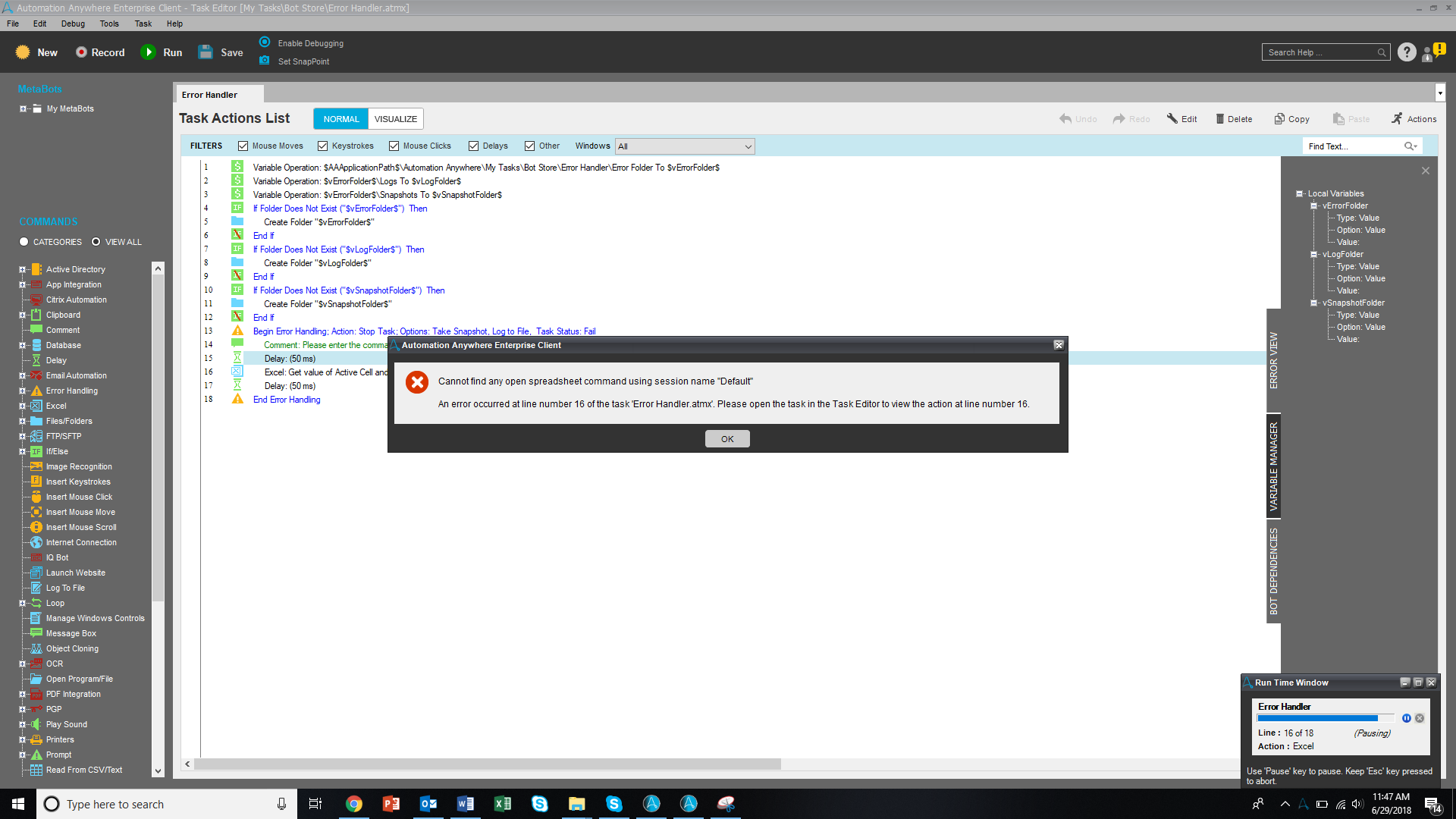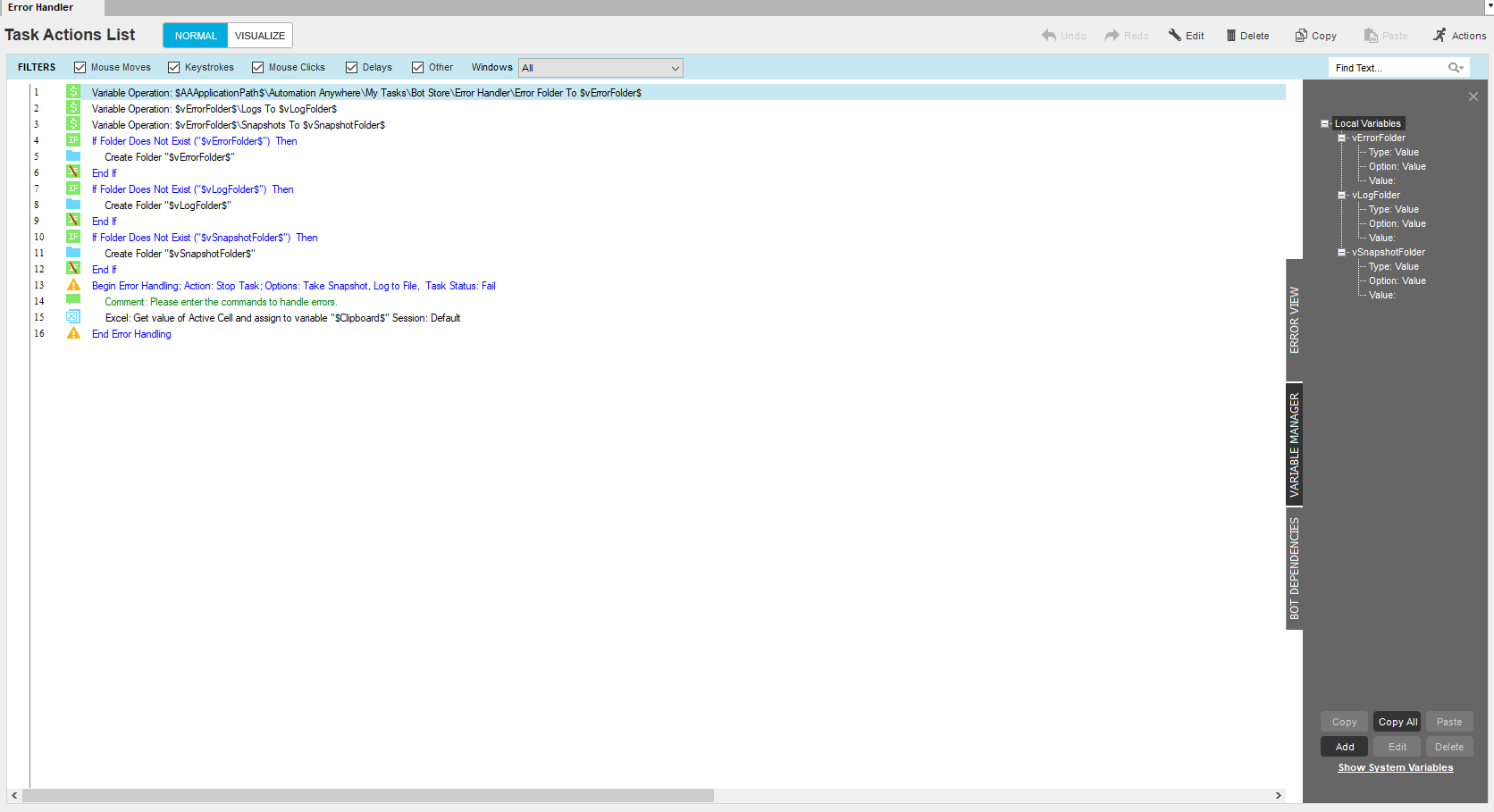 Copy the code to the Bot file where you want to develop Error Handling. Replace the 'Error Handler' with the bot name as shown below - $AAApplicationPath$Automation AnywhereMy TasksBot Store Error Folder