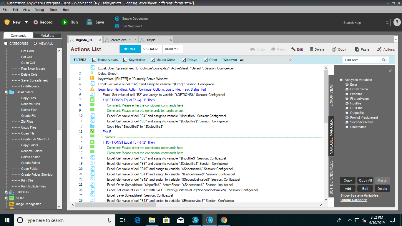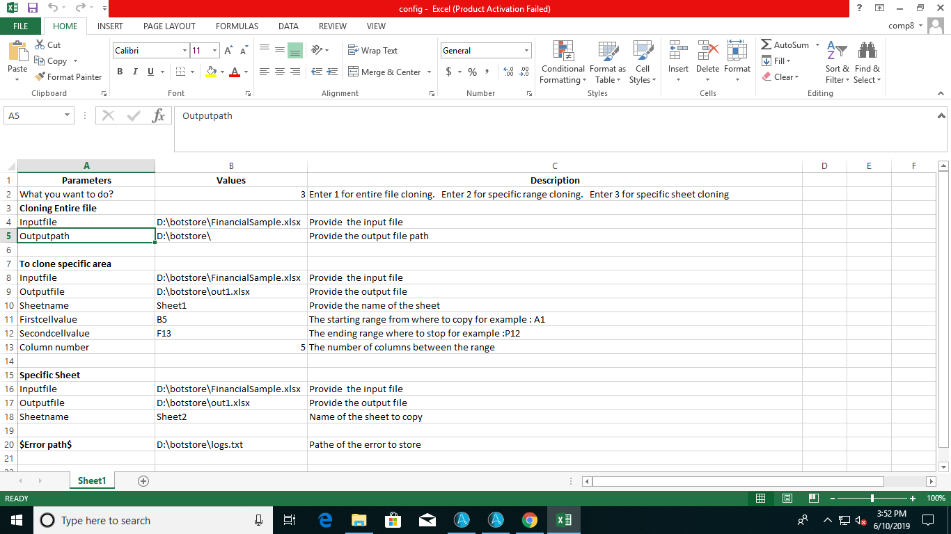 Use this bot to clone data ranges in Excel. It can clone an entire file, a specific sheet, or a specific cell range. VBscript is used to copy a sheet, add a sheet, and add a sheet with the same name.