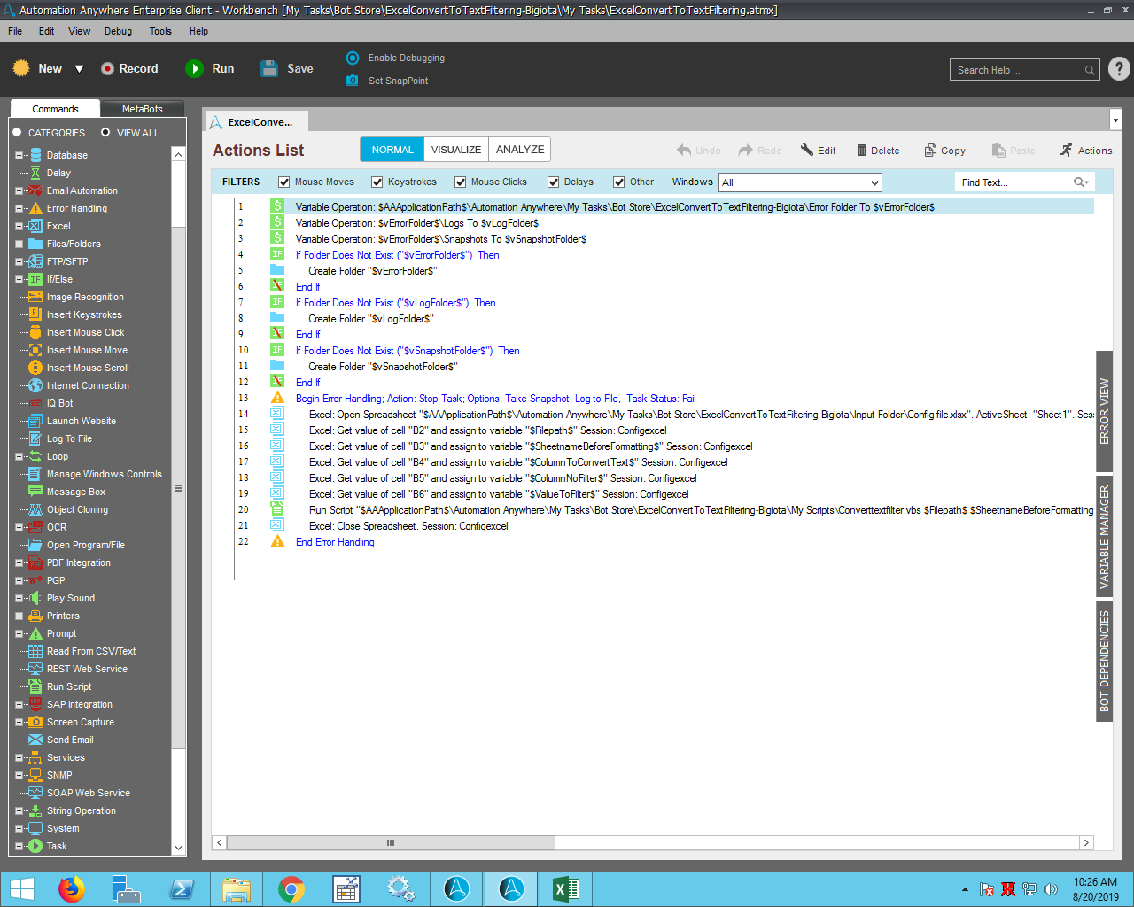 The Bot converts and Excel column into text and filters the column with a specific value.