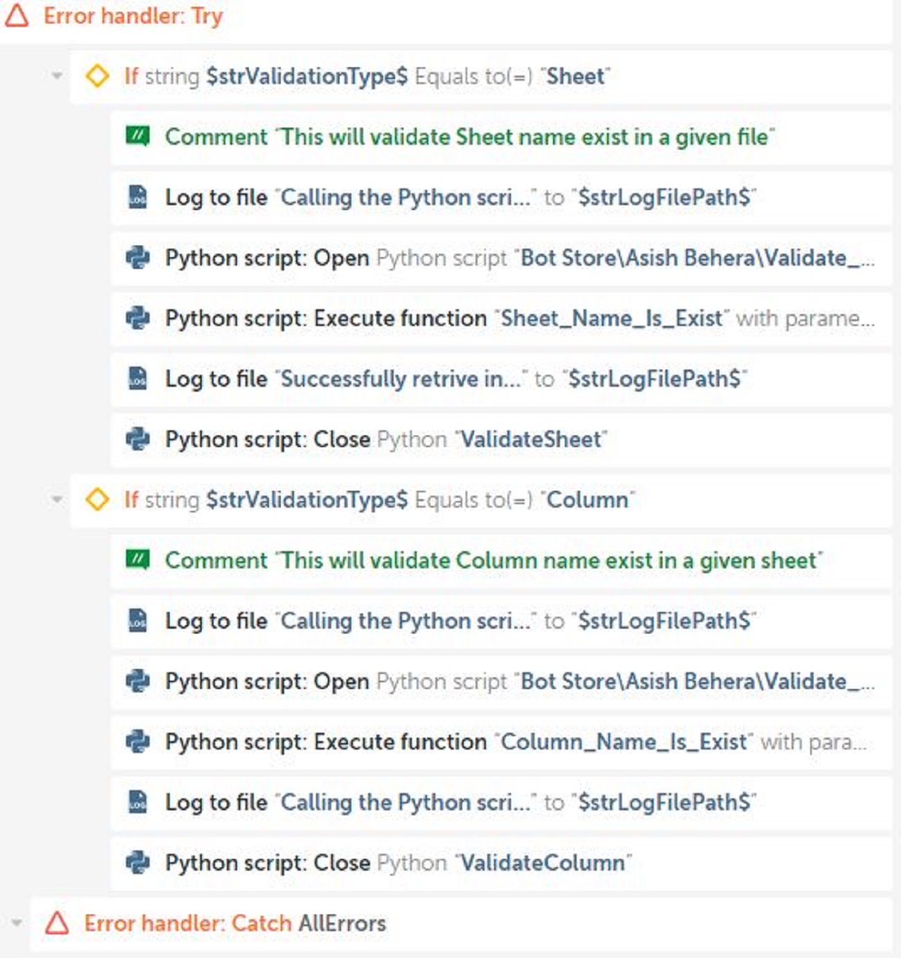 This bot will help to validate your input Excel file. It can also validate whether the sheet and column exist.