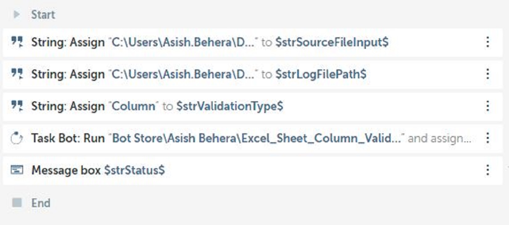 This bot has 3 input parameter, these are as below (strLogFIlePath, strSurceFileInput, strValidationType) and one output parameter (strStatus) to store the result.