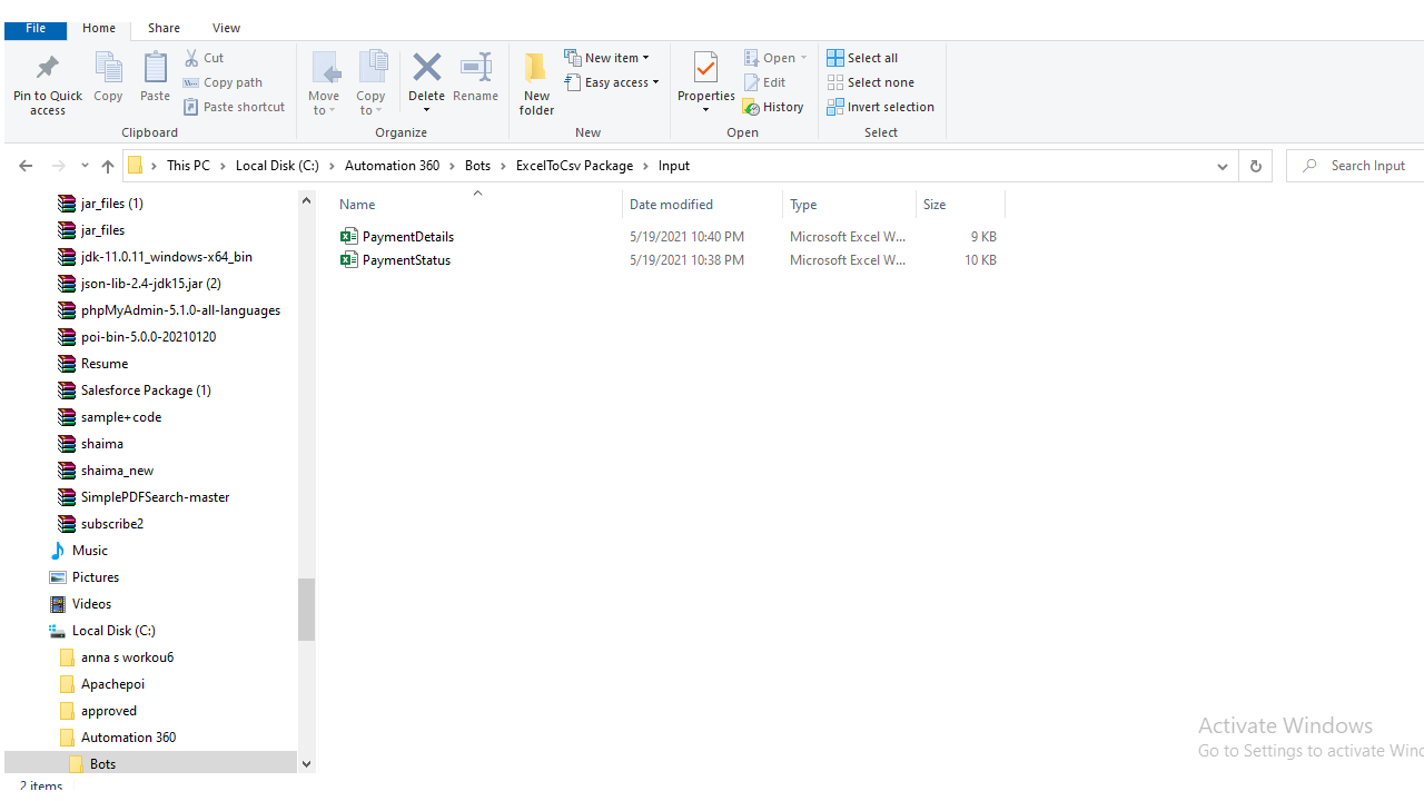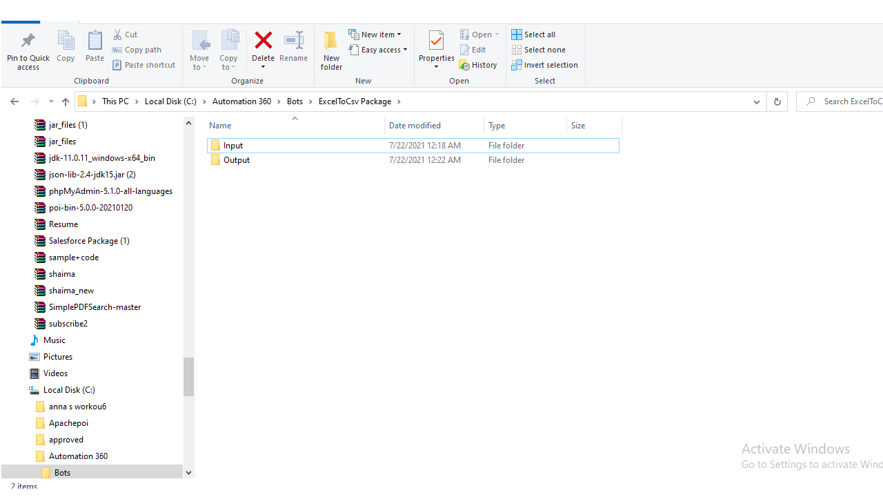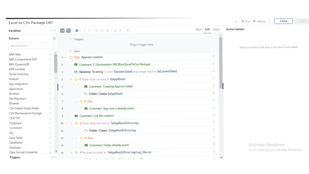 This package is used to convert an Excel file into CSV file format. It contains an action called 'Convert Excel to CSV' that uses the files to convert. Loop action can be used to convert multiple files at the same time. The input folder contains Excel files, which are used to convert into CSV format in the output folder.