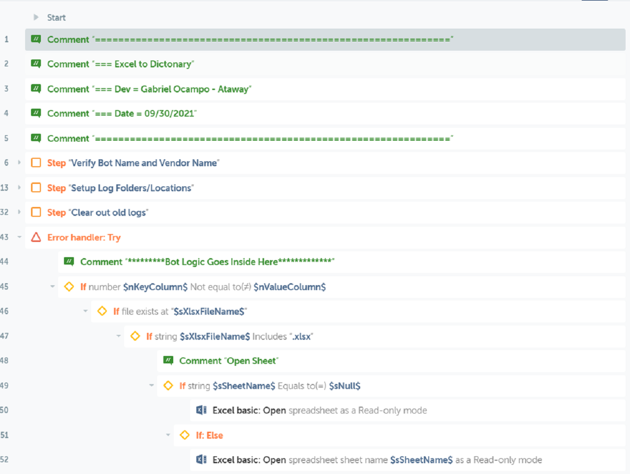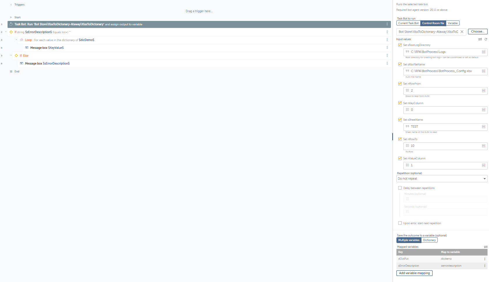 The bot, Excel to Dictionary, is designed to read an XLSX spreadsheet and save it in a Dictionary variable string with only a command. This helps to reduce the RPA Developers' time. Microsoft Excel is not required and only supports XLSX files.