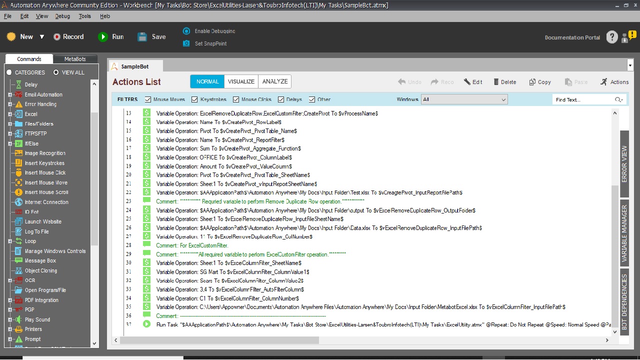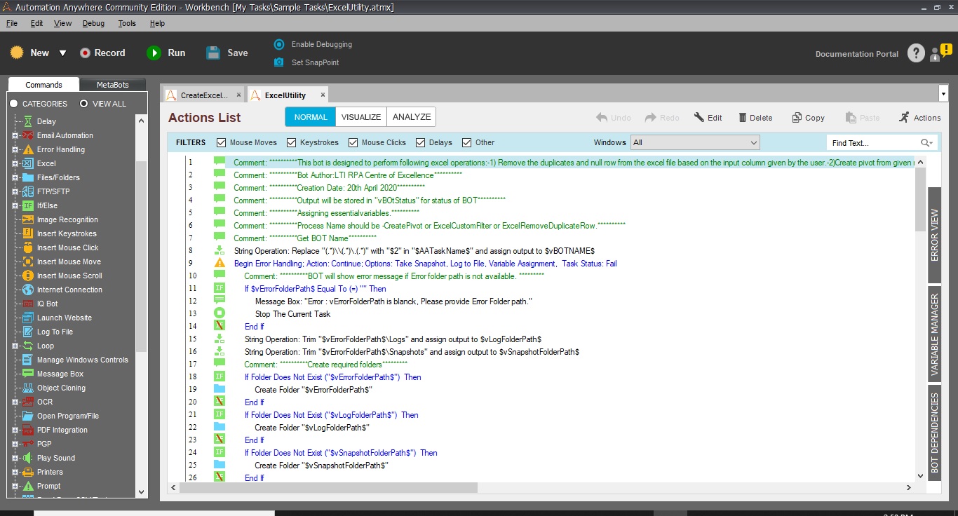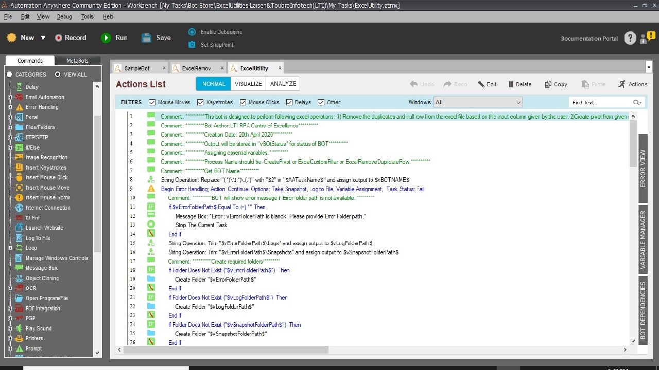 Microsoft Excel is the most commonly used standard IO for automated processes. There are multiple data massaging operations required before any process execution by the Bot. Excel Utility Bot provides faster and robust options to massage the data and create pivots before starting any operation as per the configurations. We have provided a sample Bot to demonstrate easy integration with this utility Bot.