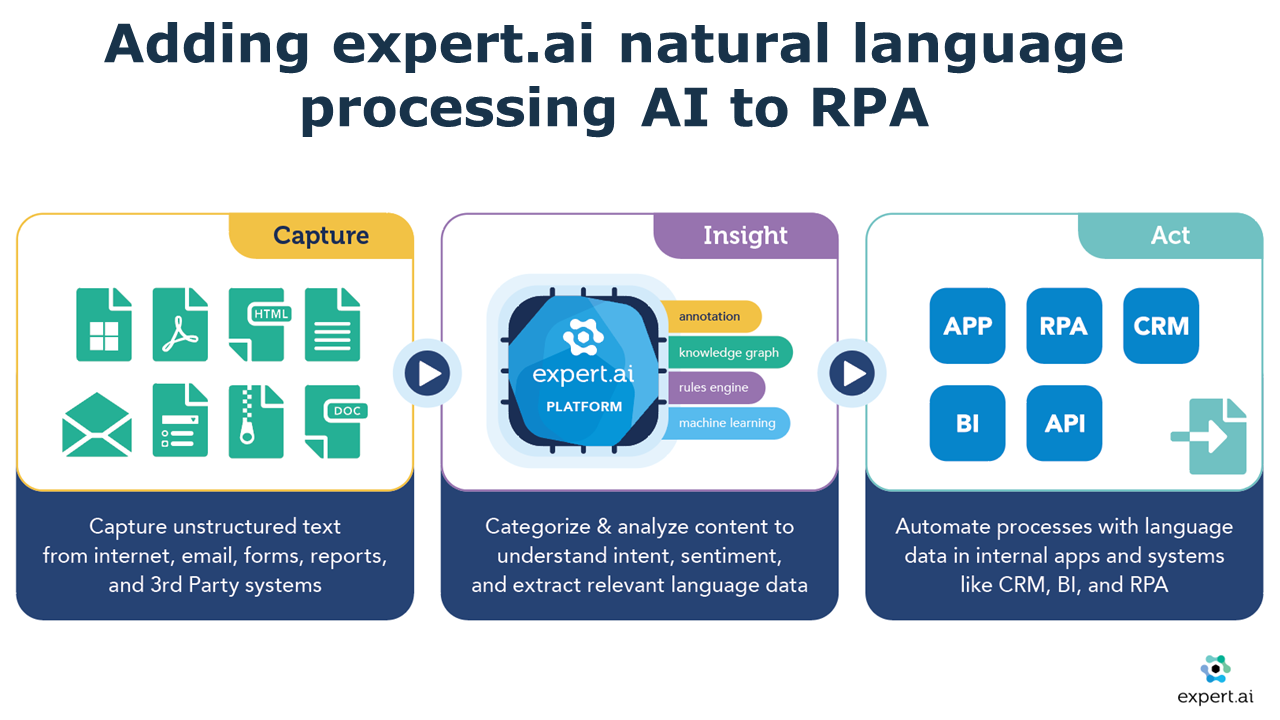 The integration of expert.ai's Hybrid NLP with Automation Anywhere helps enterprises automate repetitive business processes based on large volumes of unstructured data—text documents, email, customer interactions, call notes etc., reducing errors, improving efficiency and increasing scalability of operations.