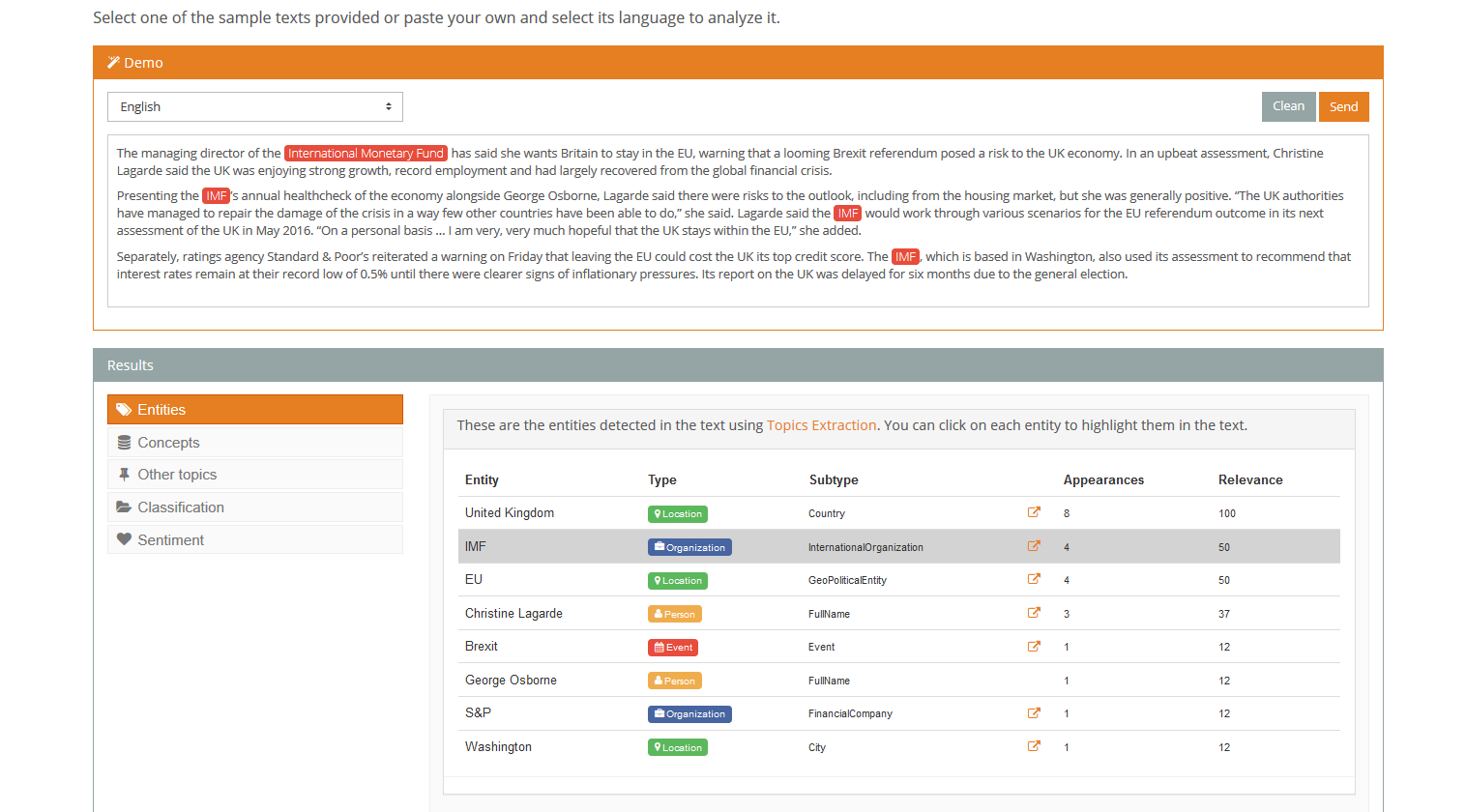 The extraction of named entities provides a simple and actionable version of this footprint, by unambiguously identifying the people, organizations, brands, or places that appear in the text.