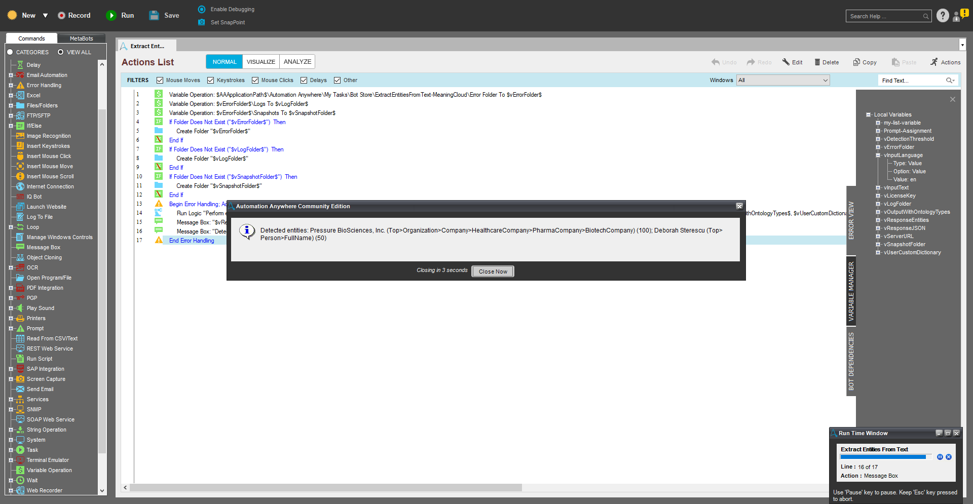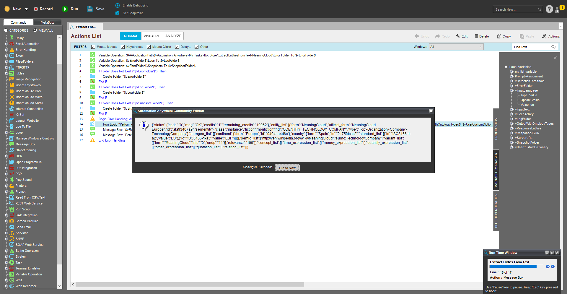 Bot will output the entities, their semantic type (if configured), relevance, and a JSON with the complete analysis returned by the API.