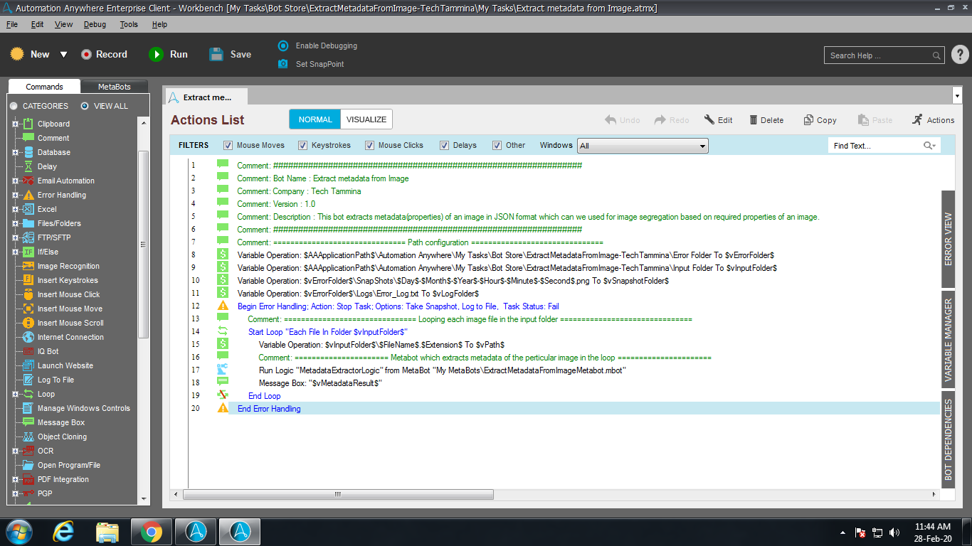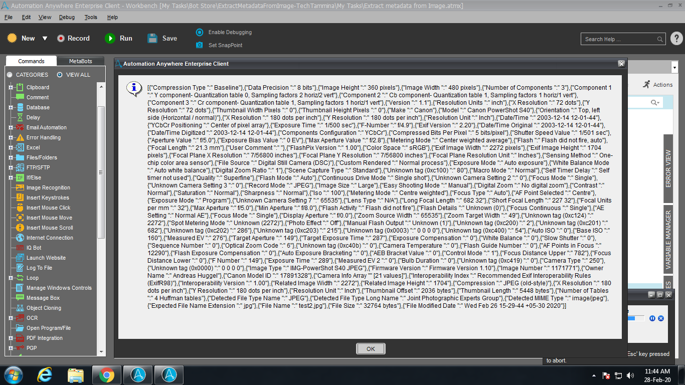 * This bot extracts MetaData (properties) of an image in JSON format which can be used for image segregation based on required properties of an image.