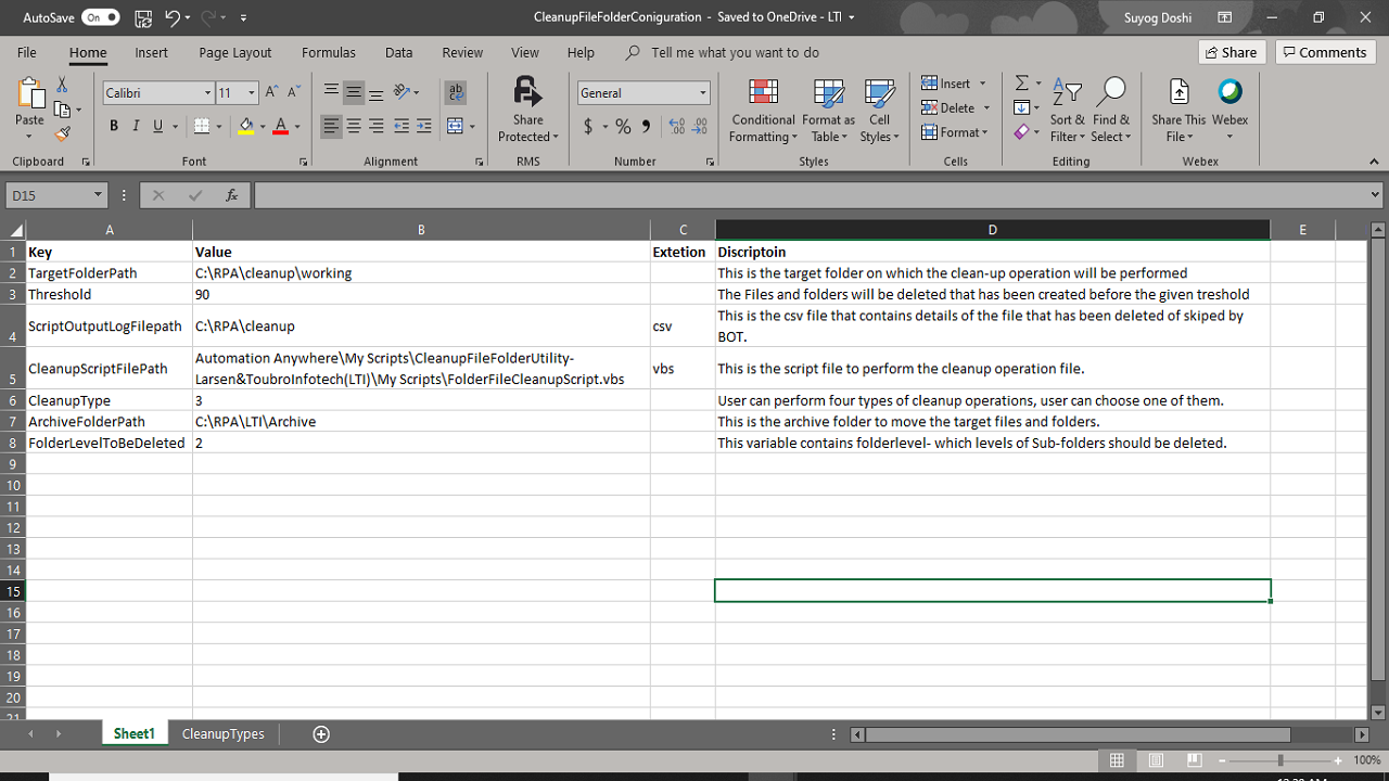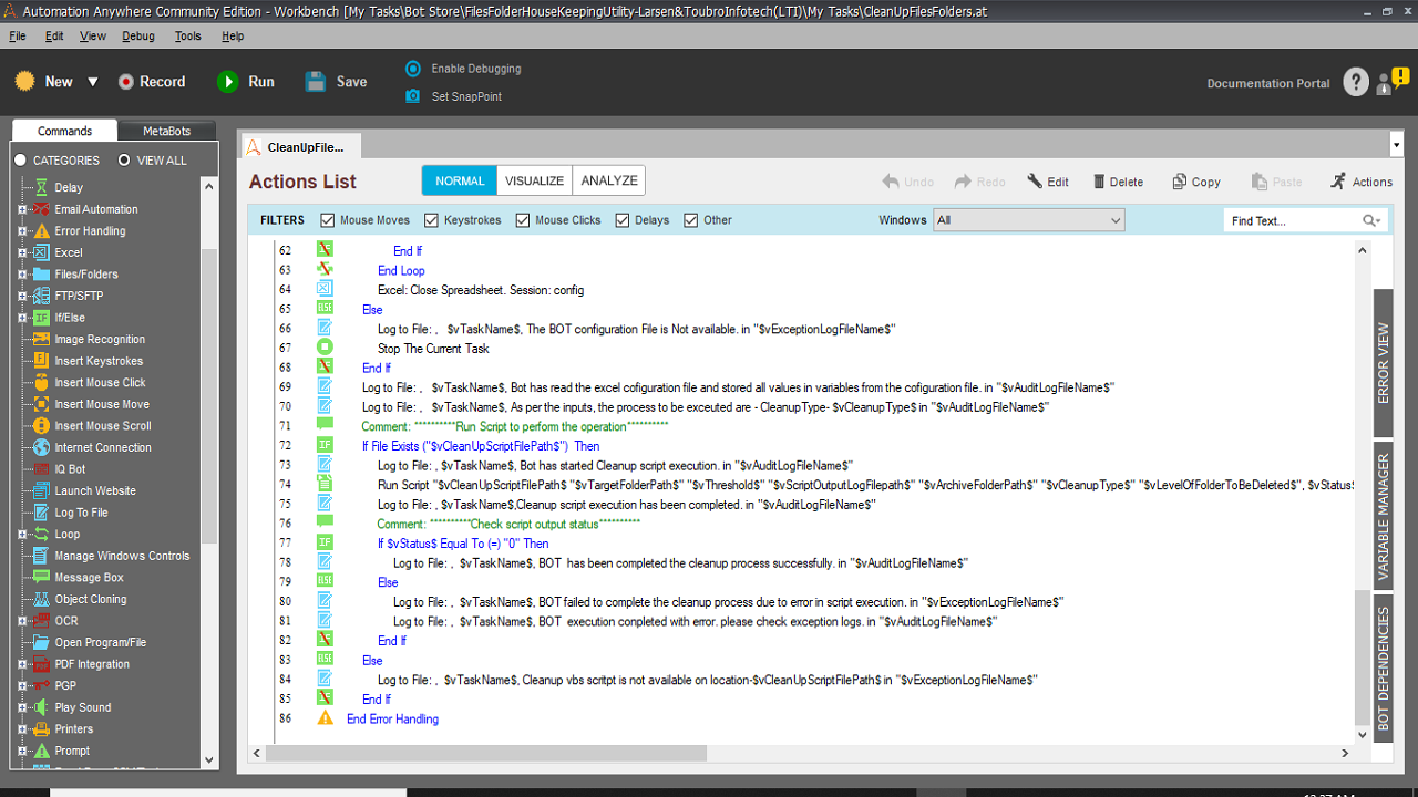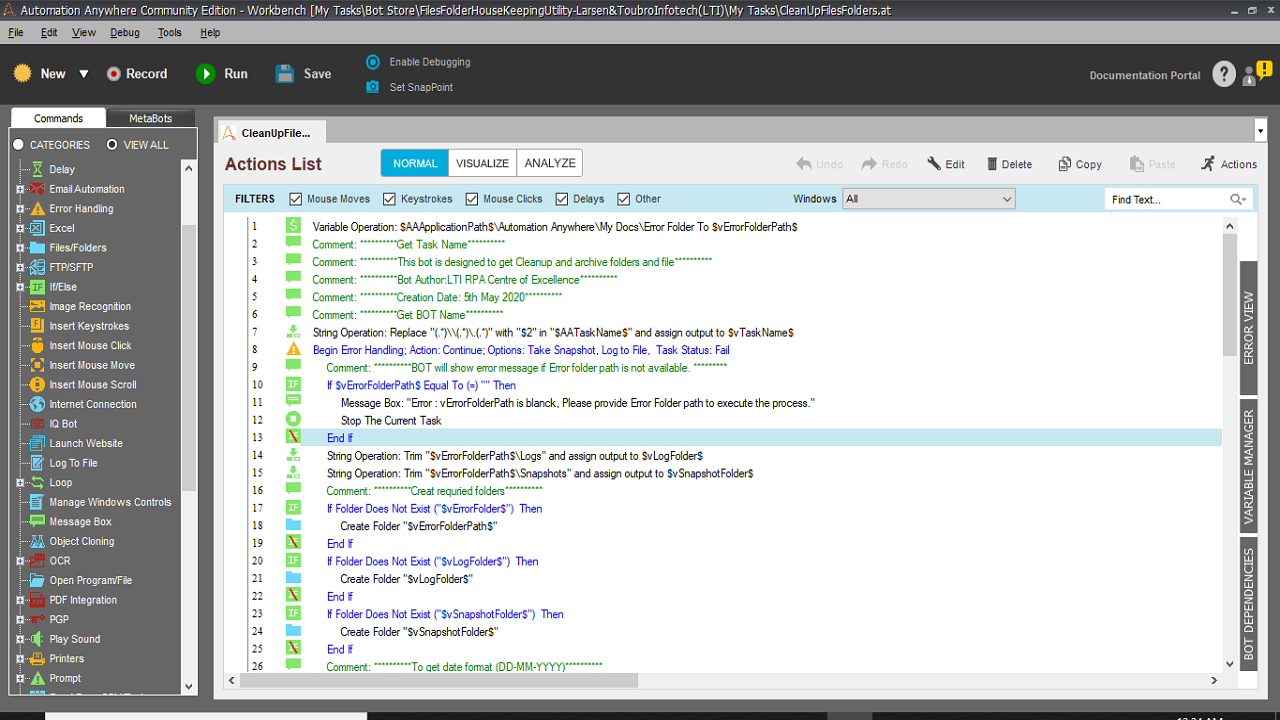 Typical file IO operations need housekeeping of the folders used for automation execution. Automation needs clean-up and archive facilities to manage working folders. Activities like deleting unused older files take extra effort. This bot provides configurable options for clean-up, archival, and deletion of the files. This utility also provides a log file in the CSV format. The log CSV contains the information of the operation like deletion and archival.