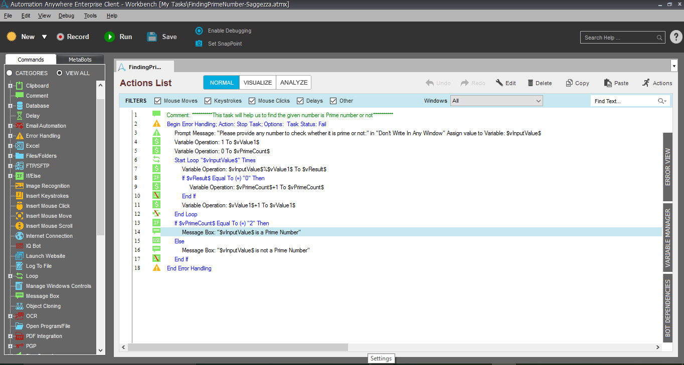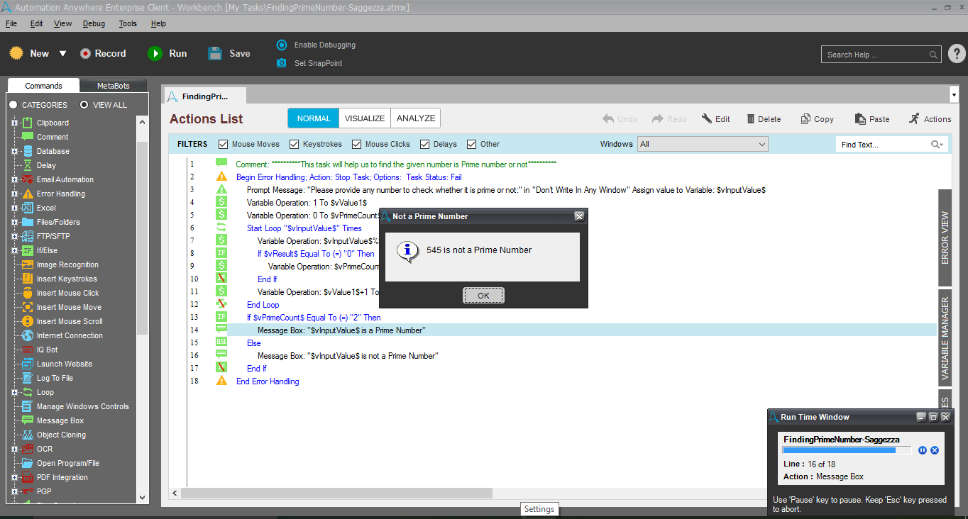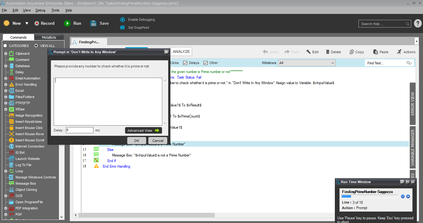 Output: Bot displays the result in a message box showing whether the given number is prime or not.