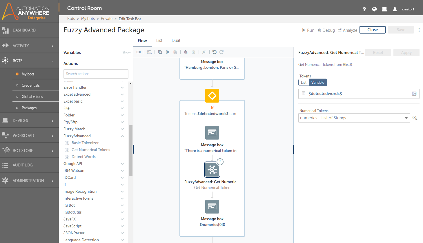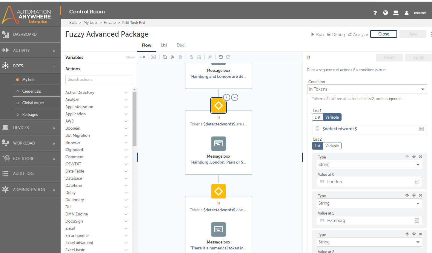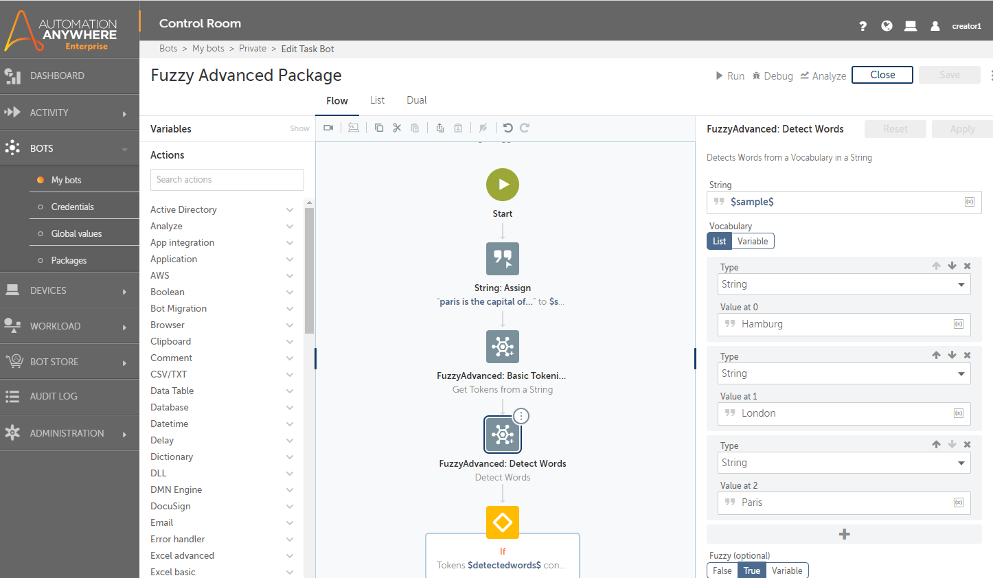With the actions of this package, you can tokenize a string and detect certain words. So a bot can detect what is the intention of an email or letter and based on the detected words, choose the next best action. Using fuzzy logic, a bot can even detect misspelled words.