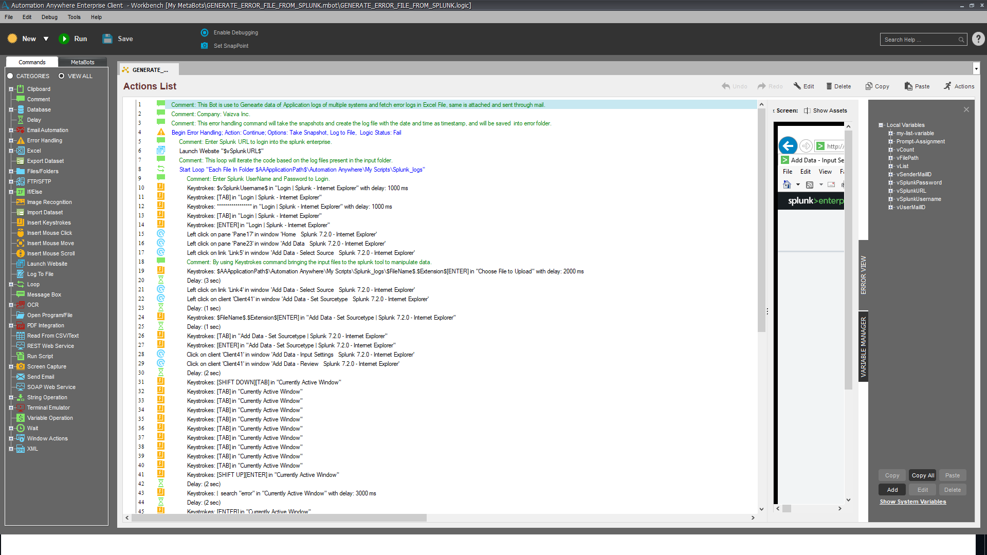 The bot will automatically check for the application log files in the specified folder and generate the error report for all the files by using the Splunk application as opposed to having to install and leverage the Splunk forwarder.