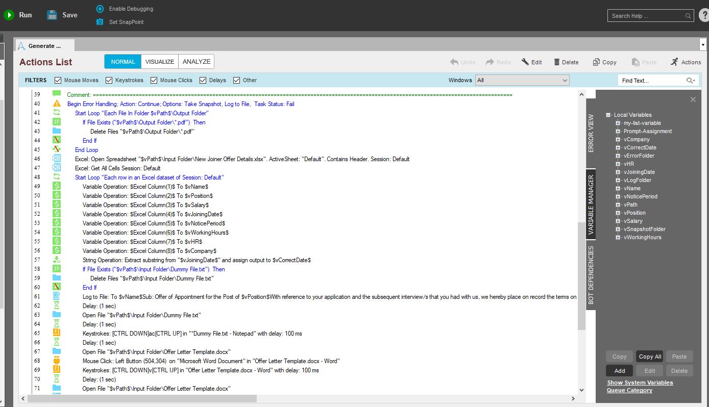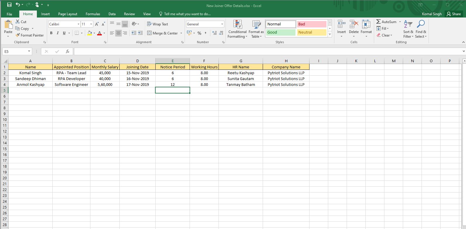 - No Human intervention. Bot creates offer letter by gathering information from the Excel template.