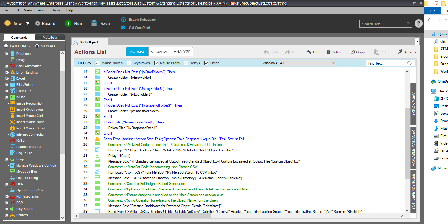 This Bot retrieves object details from Salesforce, and separates custom and standard objects. It saves the object properties and attribute details to a CSV file.
