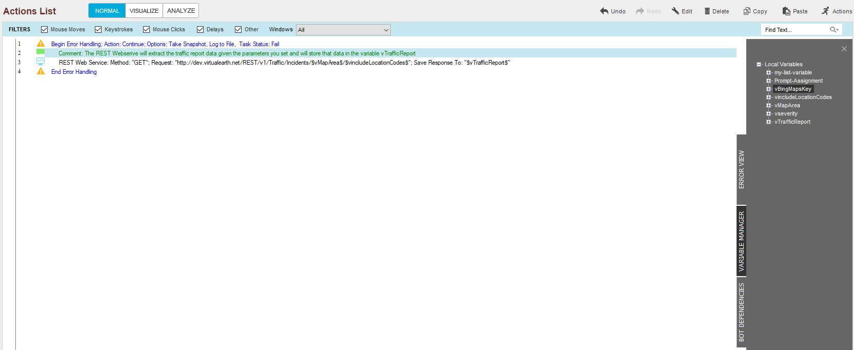 Gain a detailed traffic report from Bing Maps based on the parameters given to the bot, that is then stored for later RPA applications.