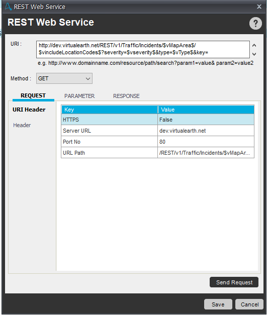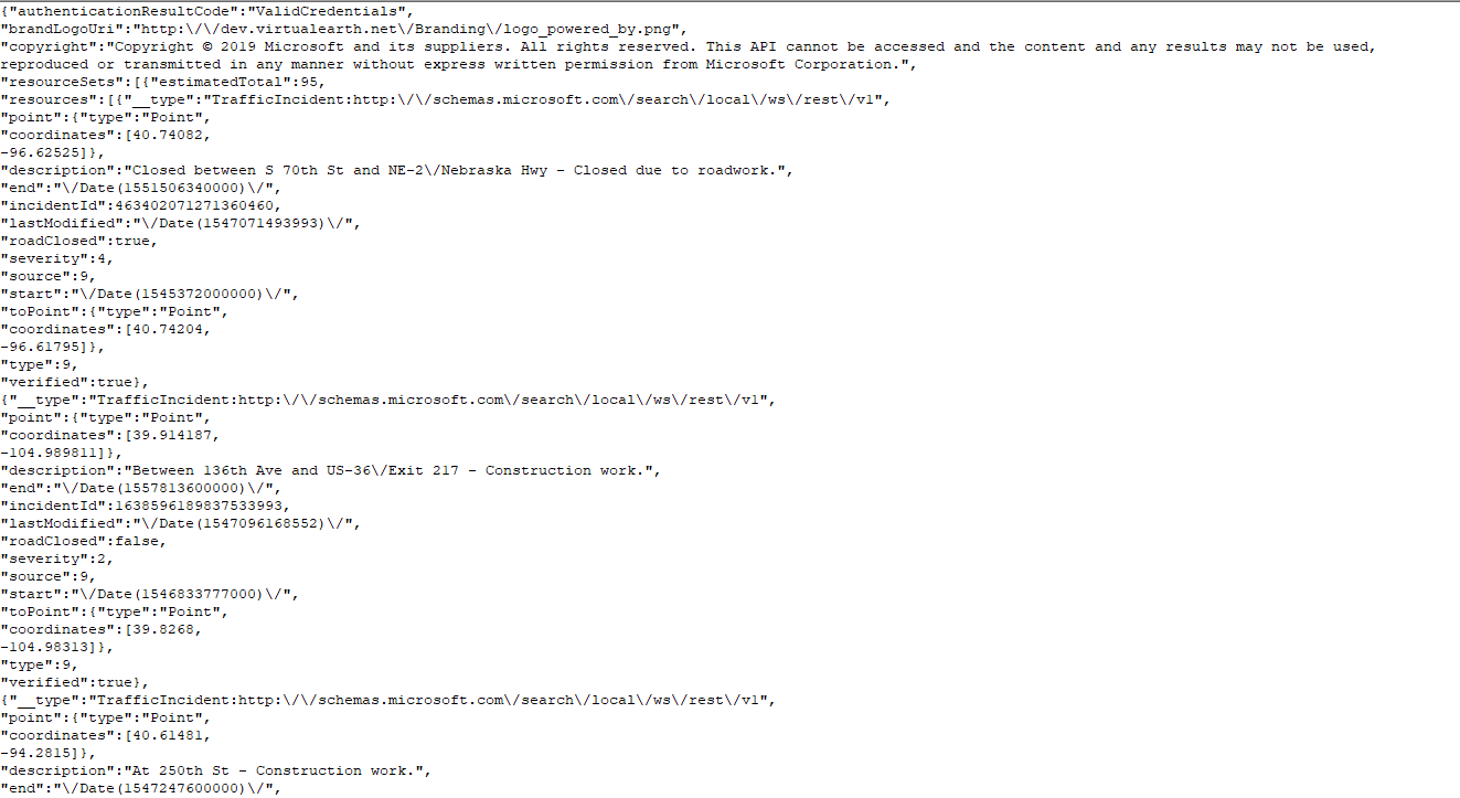 - Inputs: vMapArea: A rectangular area specified as a bounding box. vincludeLocationCodes: Specifies whether to include traffic location codes in the response. vseverity: Specifies severity level of traffic incidents to return. vType: Specifies the type of traffic incidents to return. vBingMapsKey: An api key generated from your Bing Maps account. More information on how to do this in the README.