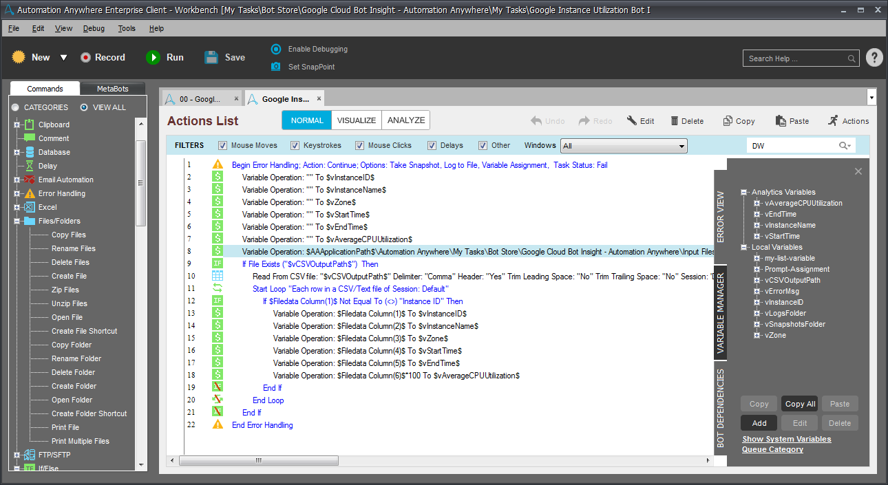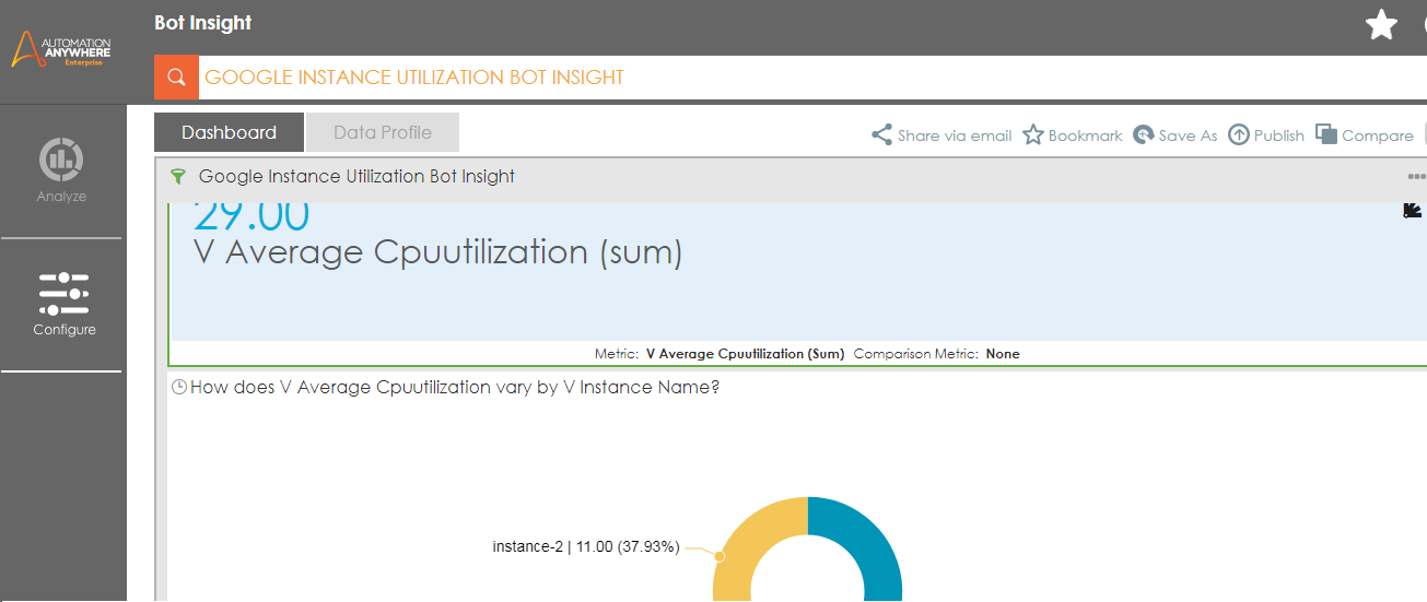 - Easy to use and integrate in new tasks without any technical supervision. Bot execution results in auto generated dashboard for Google Cloud Instance Utilization report process showing valuable metrics to the end user.