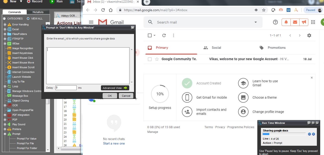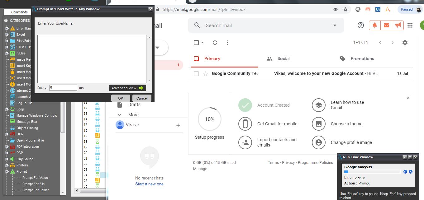 User must enter the google mail of the person you want to invite. Enter your username, password, and email_id in prompt and assign it to variables 'User Name' and 'Password' and run the task.