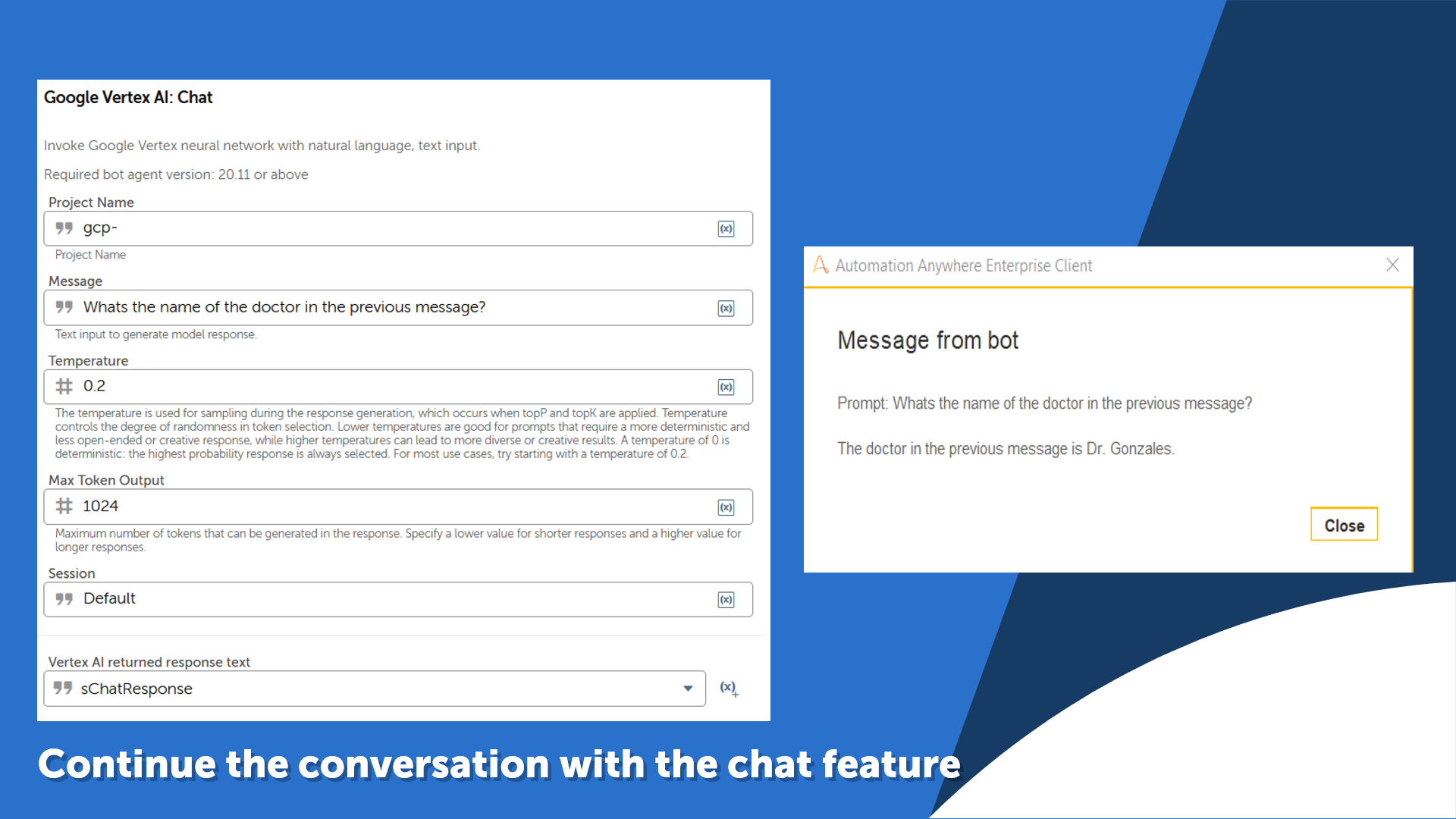 With the Google Vertex AI Automation Anywhere package, you can revolutionize task and process automation. Harness the potential of AI to generate and execute scripts, provide seamless responses to customer inquiries, engage in natural conversations, and much more. Whether you aim to optimize operations, save time, or elevate customer experience and satisfaction, the Google Vertex AI Automation Anywhere package is the ideal solution.