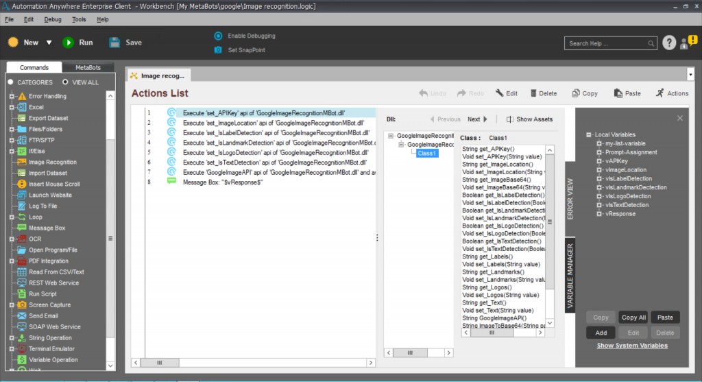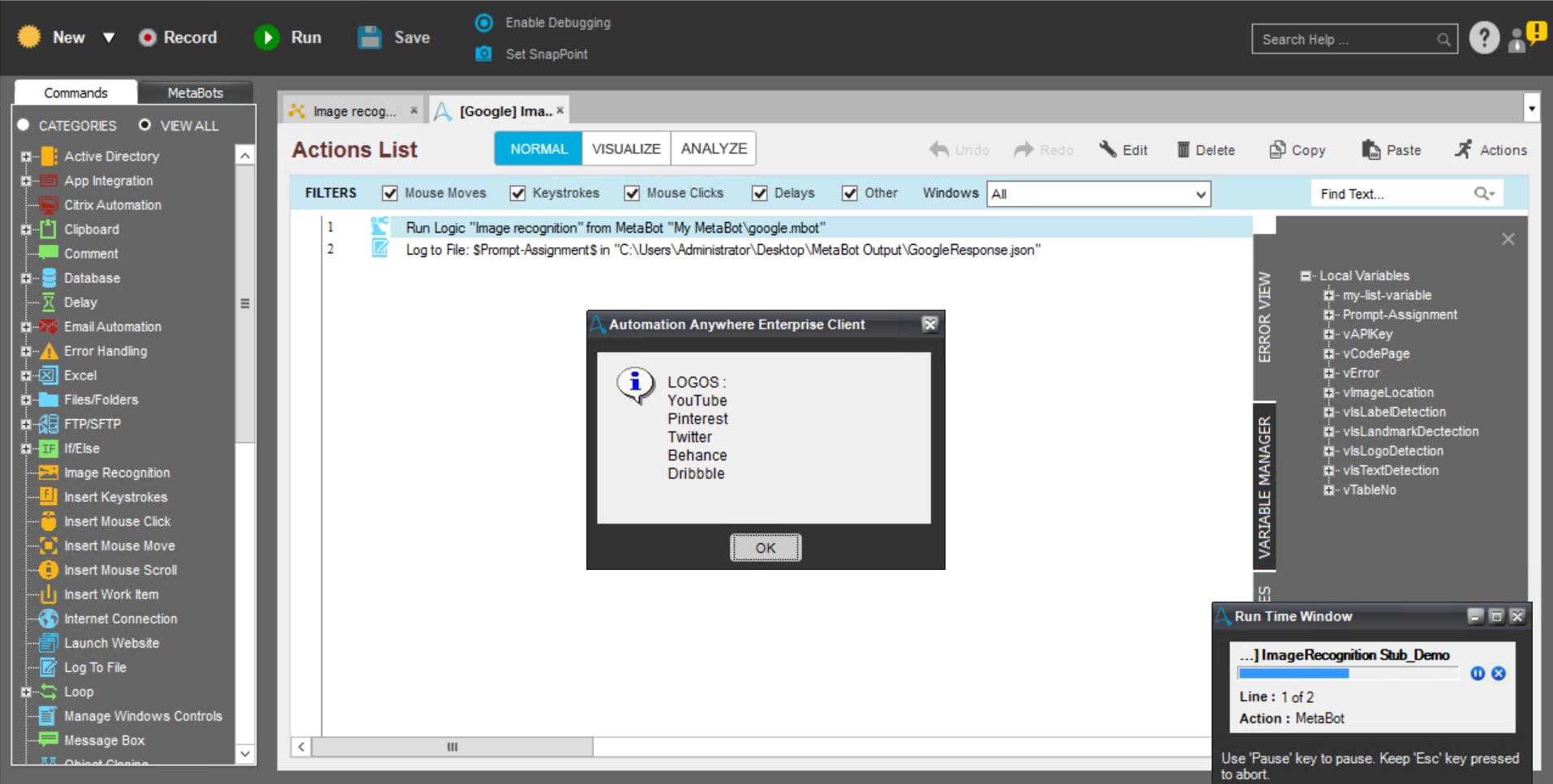 This bot is designed to work for any user by simply plugging this bot in existing or new task to perform image recognition analysis using Google Vision API. This bot can provide labels, landmarks, logos, and text annotations. Please check "More Details" section for details on parameters.