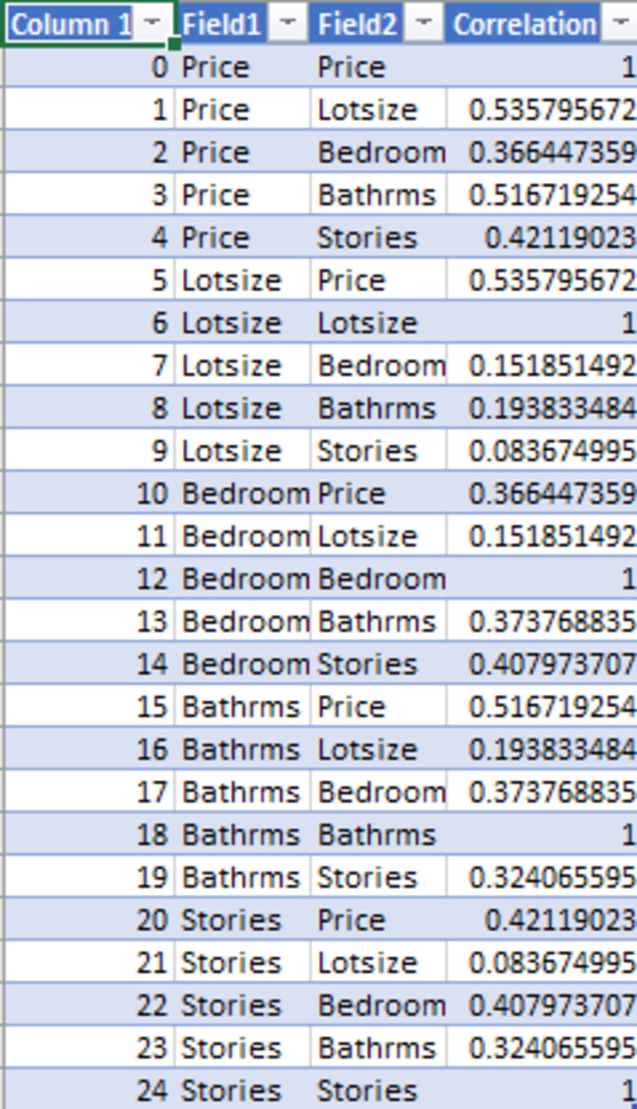 - Column field1 and field2 has the column names on which correlation has been processed.