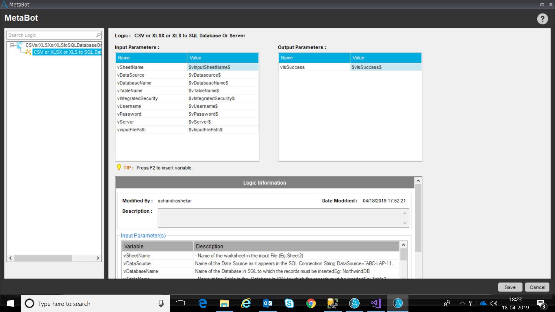 - Inputs: Input CSV or XLSX or XLS file Path, Sheet Name, SQL Server or Datasource(either one),Integrated Security(True or False),Username and Password to logon to SQL Server(if Integrated Security=false),SQL DatabaseName, SQL Table Name