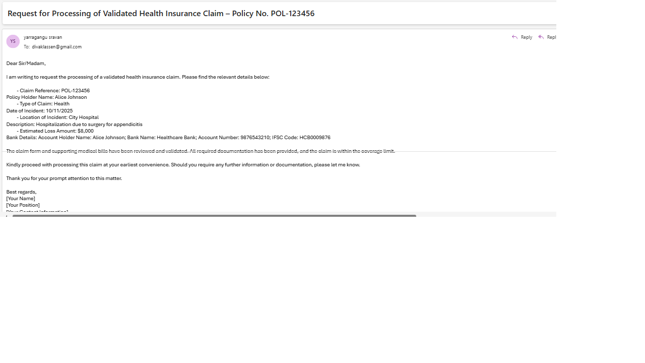 If validation is successful, an Email Agent automatically drafts and sends a structured email to the insurer, requesting claim processing.