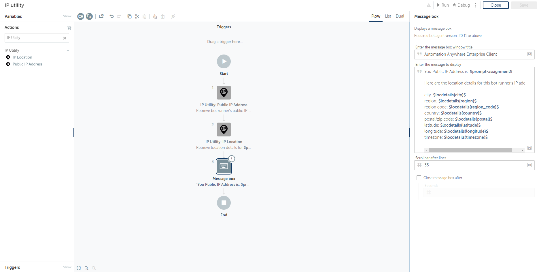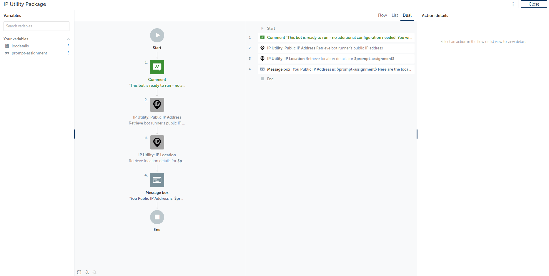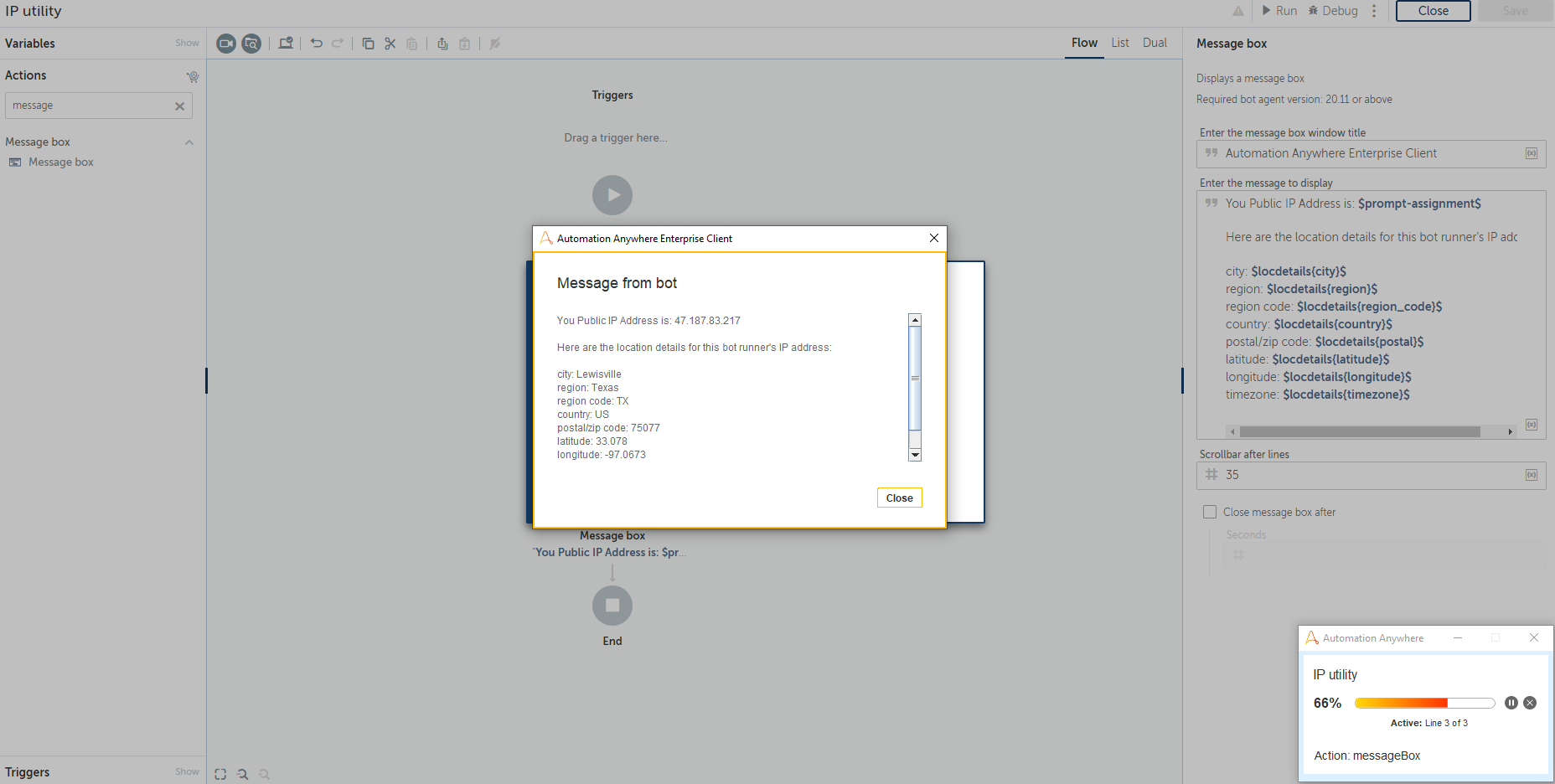 This package enables a bot to easily obtain and leverage the public IP address of a bot runner device as well as return the location details for any input IP address.