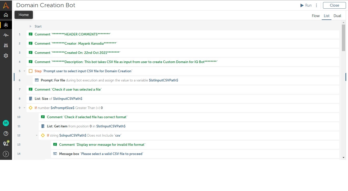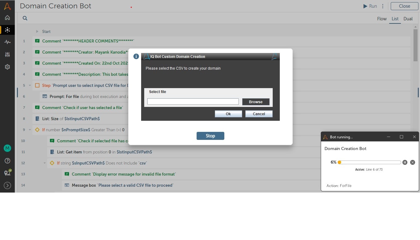 This task takes a CSV file as input from the user and converts it to a structured JSON file using actions from the Excel package. Then it invokes the authentication API on IQ Bot to obtain the authorization token which is then used to upload the converted JSON to Domain Creation API