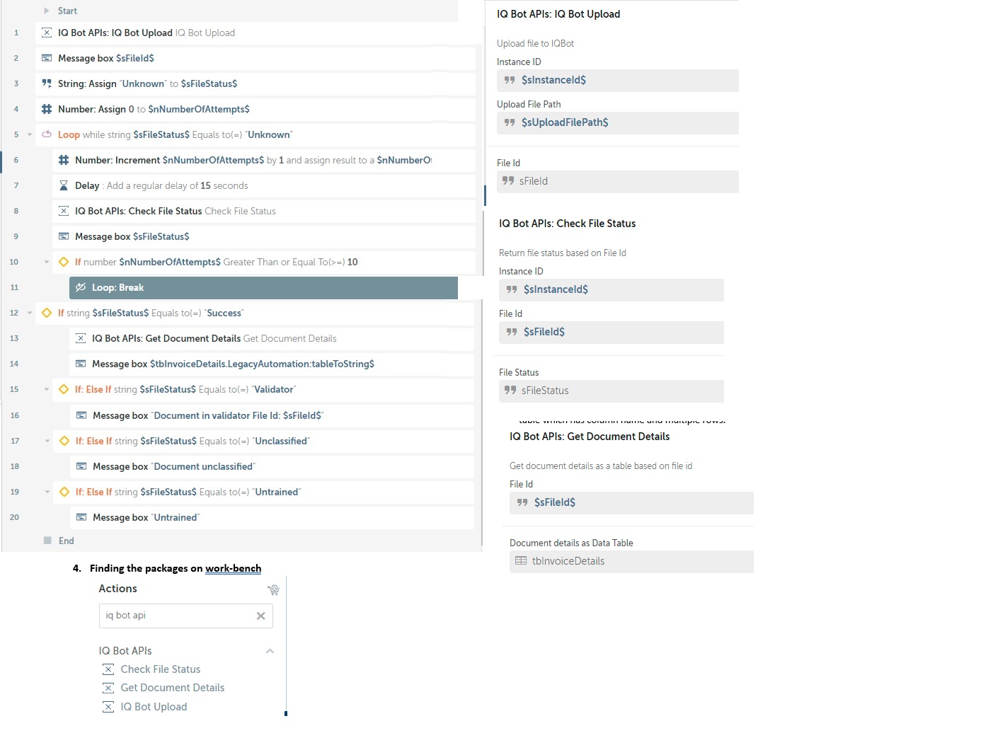 - These actions help upload/track/download the documents to IQ Bot by tracking the file ID