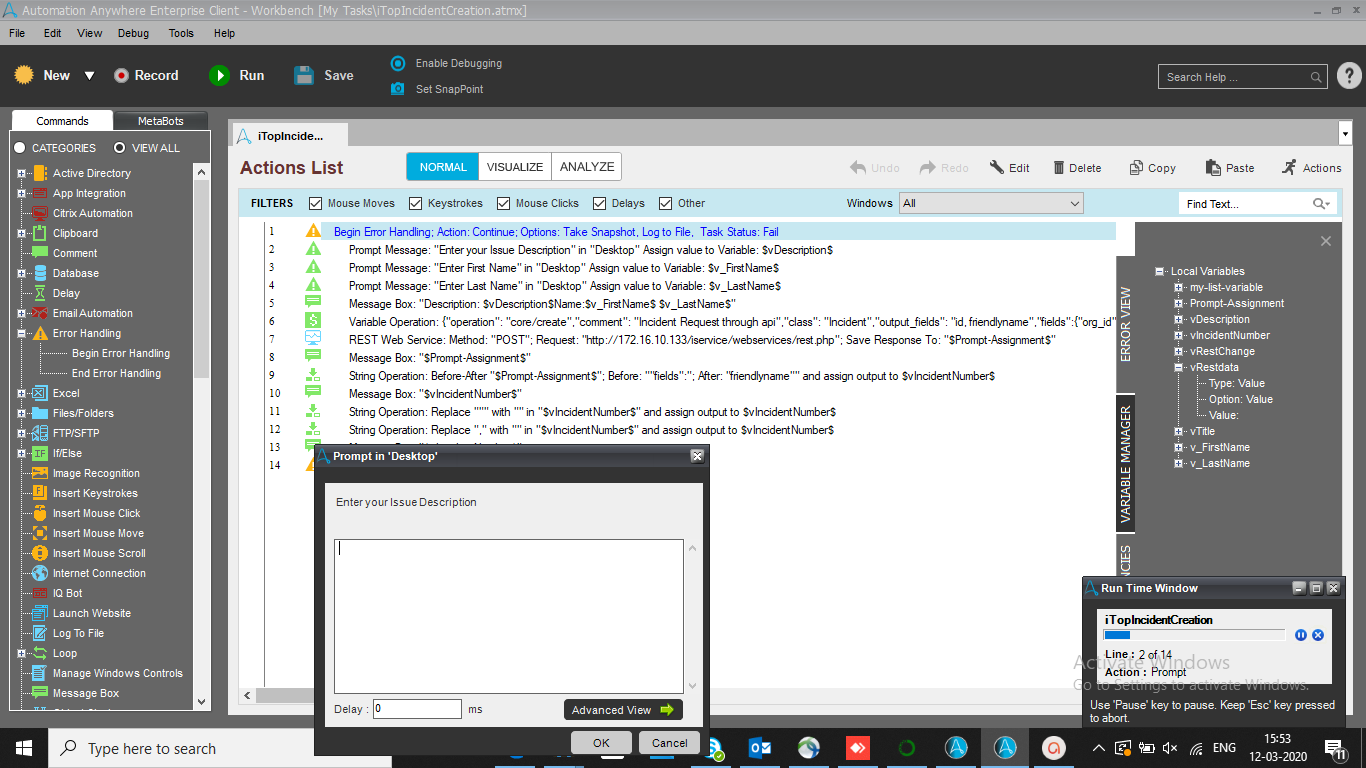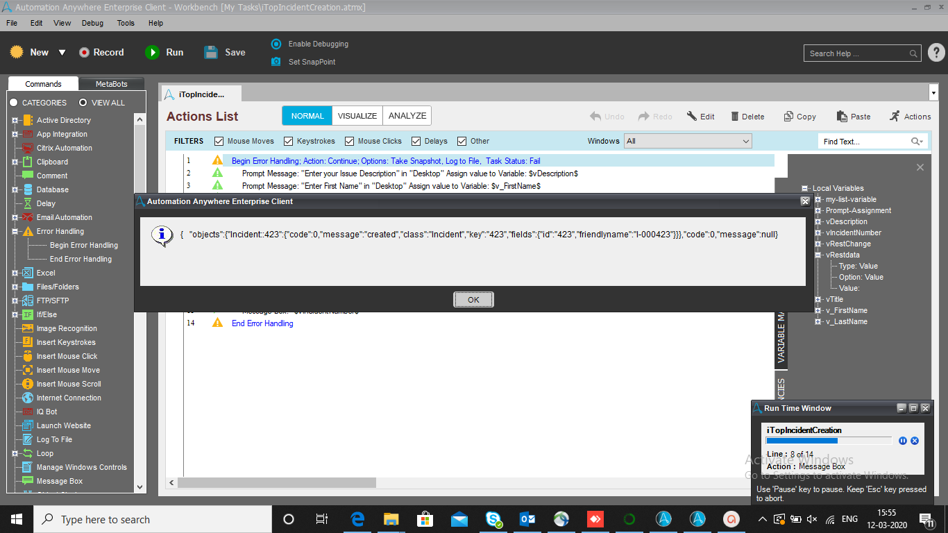 This bot will read the value from prompt assignment and pass it to the Rest API. It will hit the API then create the incident in iTop. After completion of the bot, the user will see the incident number in a message box without going into iTop. The ticket number will show in the message box so the user can note the incident number.