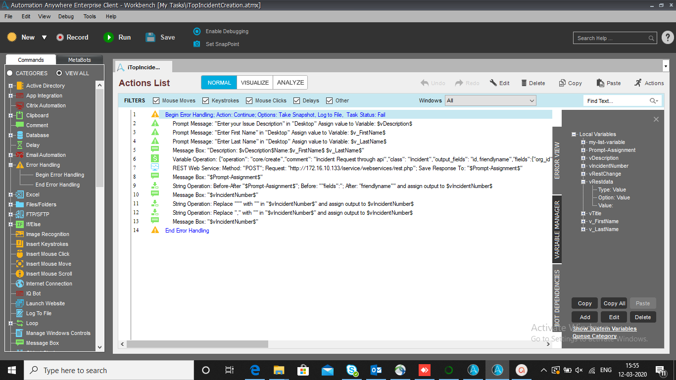 This bot will read a value from prompt assignment, hit the Rest API, then create the incident in iTop.