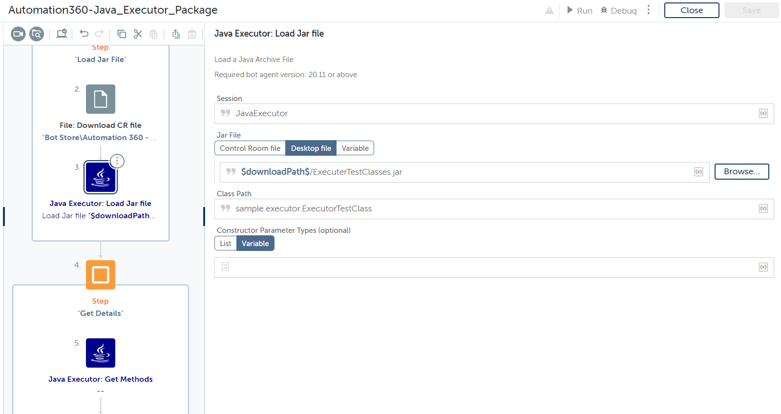 The package provides actions to load Java JAR files that contain executable Java classes. You can execute and analyze Java methods