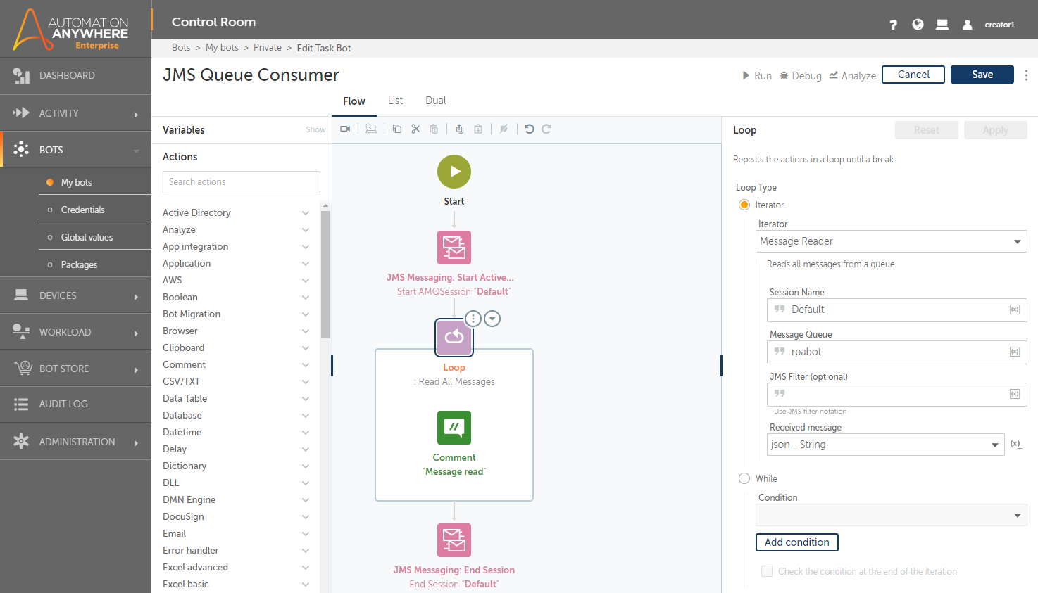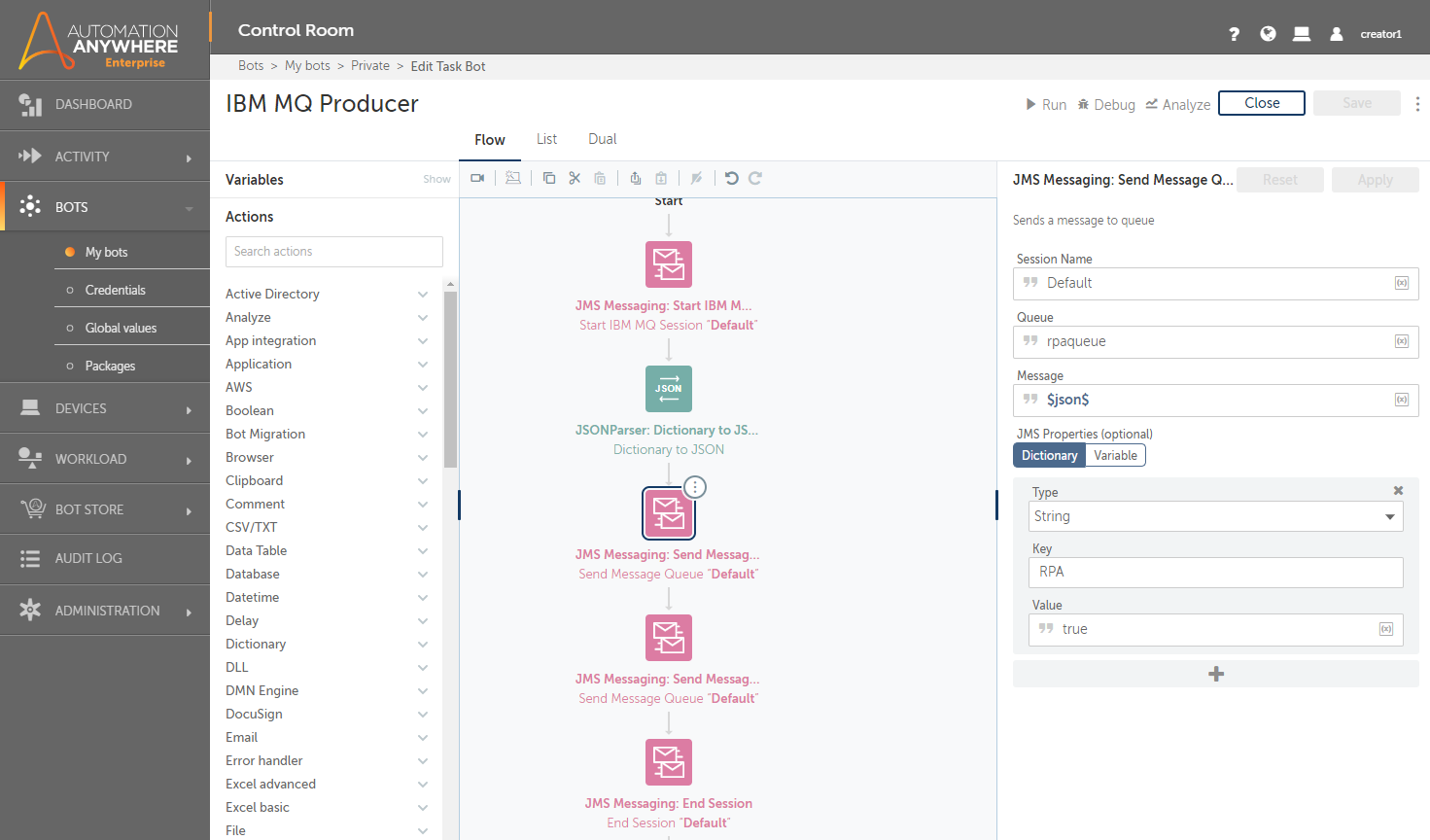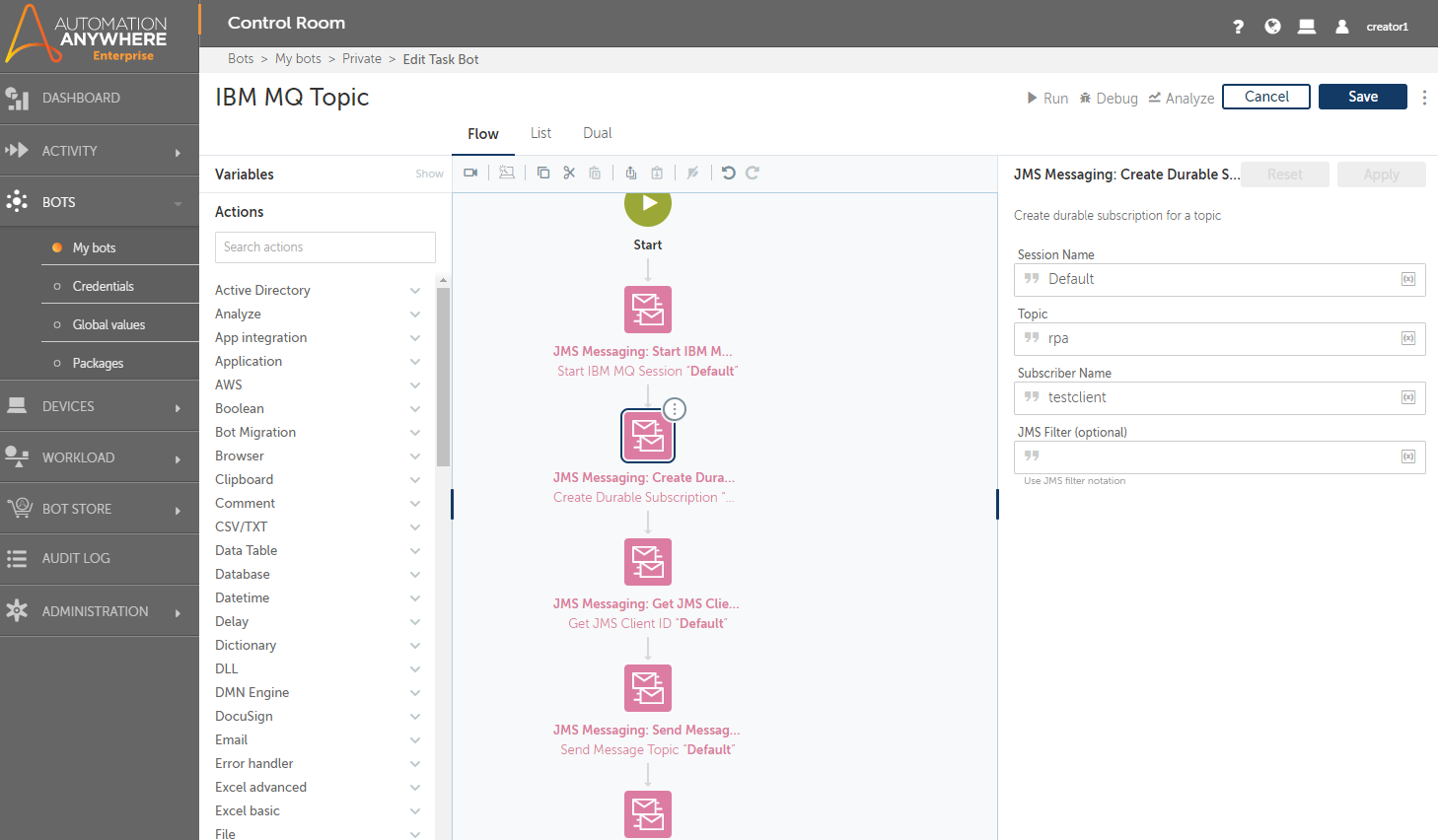 The package action will make a Bot act as a JMS client for ActiveMQ Artemis and IBM MQ messaging infrastructures.