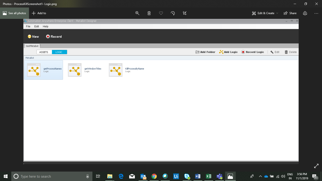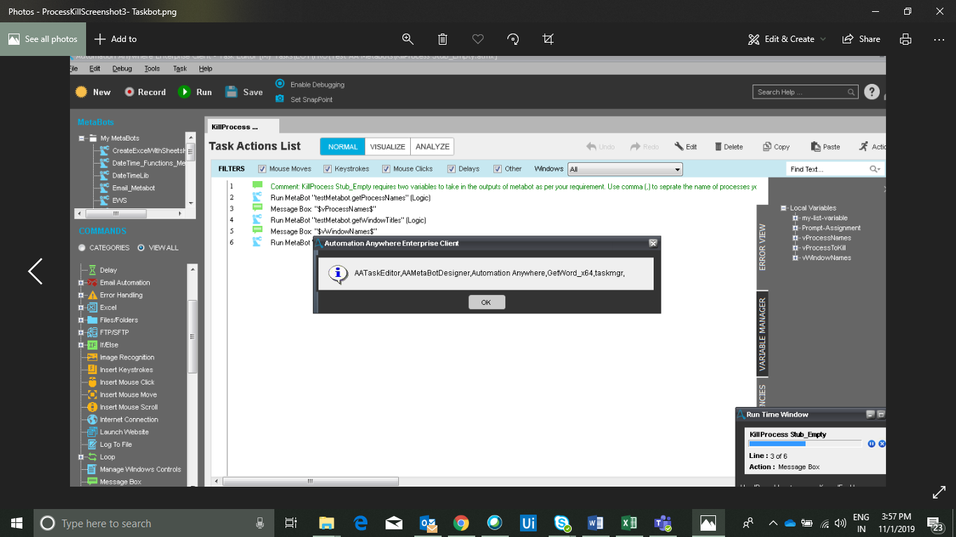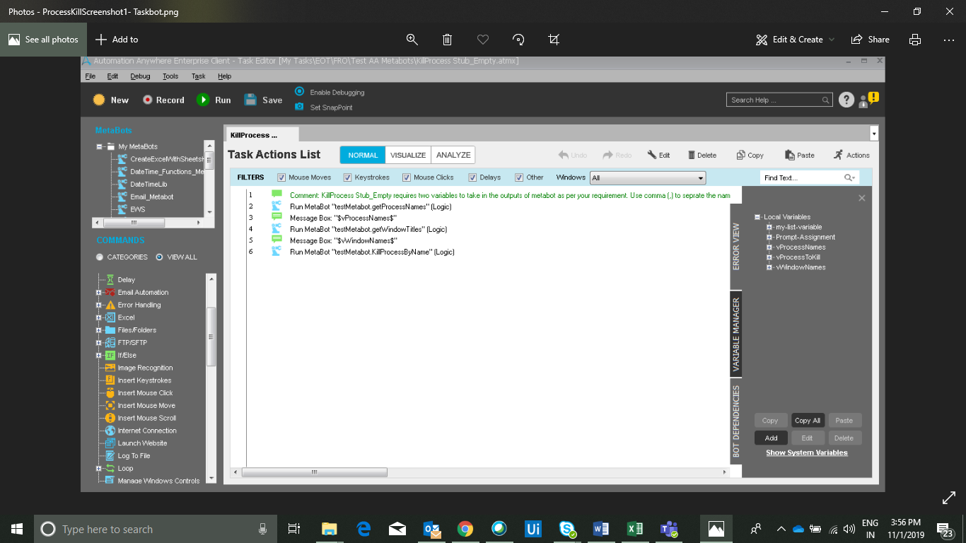 Terminate any running process. This bot is designed to show the user all the processes running in his or her session and the window-title of those processes so the user can pass the process name and kill the required process. Quick and seamless termination of all the processes, which are monotonous and would be useful after most of the tasks performed in AA. Process names, separated by a comma (,). Name of process and/or window-title.