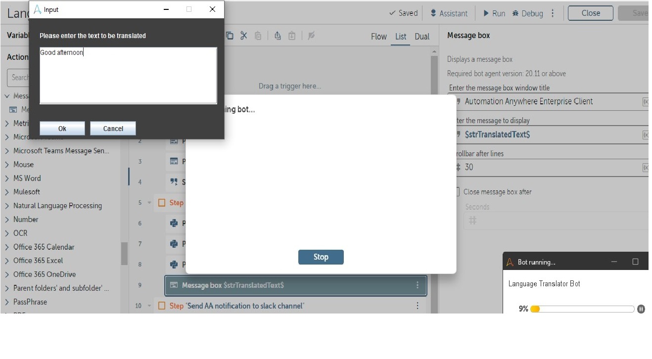 This bot takes a piece of text as input from the user and translates it to the language entered by the user as input