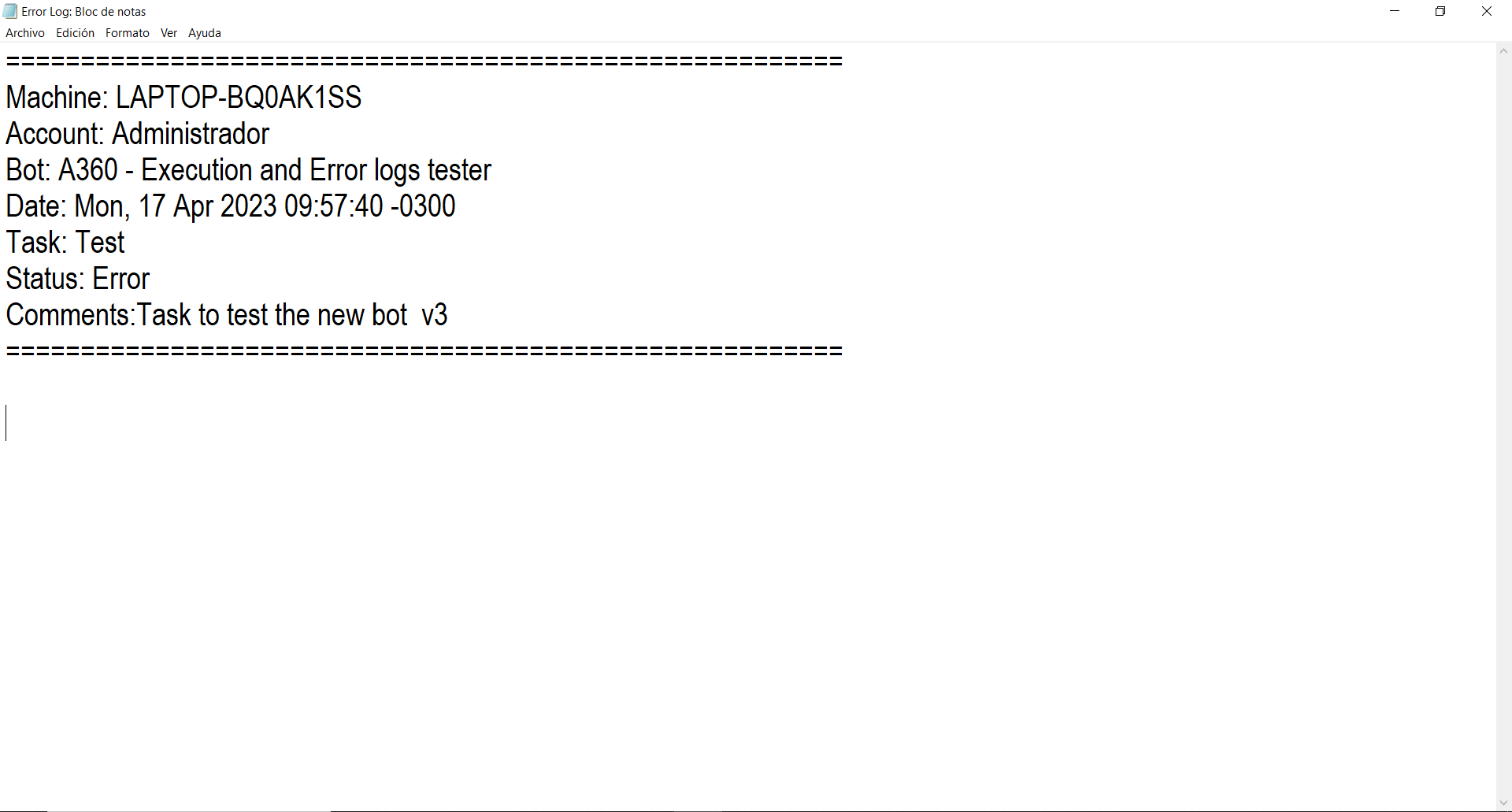 This bot takes the input variables and generates a standardized .txt log file and then generates an execution log and an error log