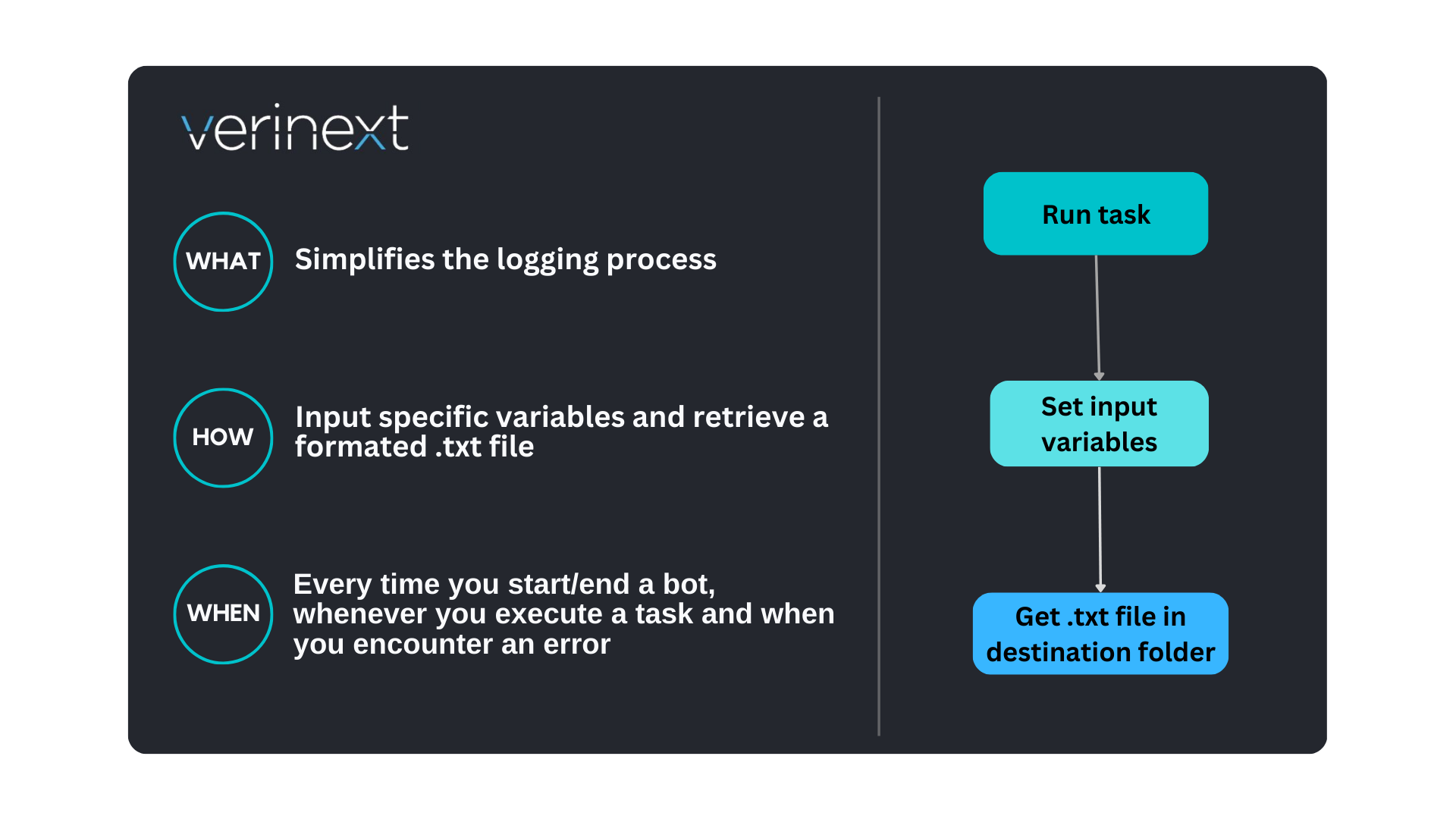Used to manage a .txt log file to facilitate the handling of the execution trail of a given bot. It will generate an Execution Log.txt and a Error Log.txt file.