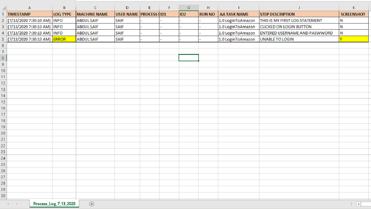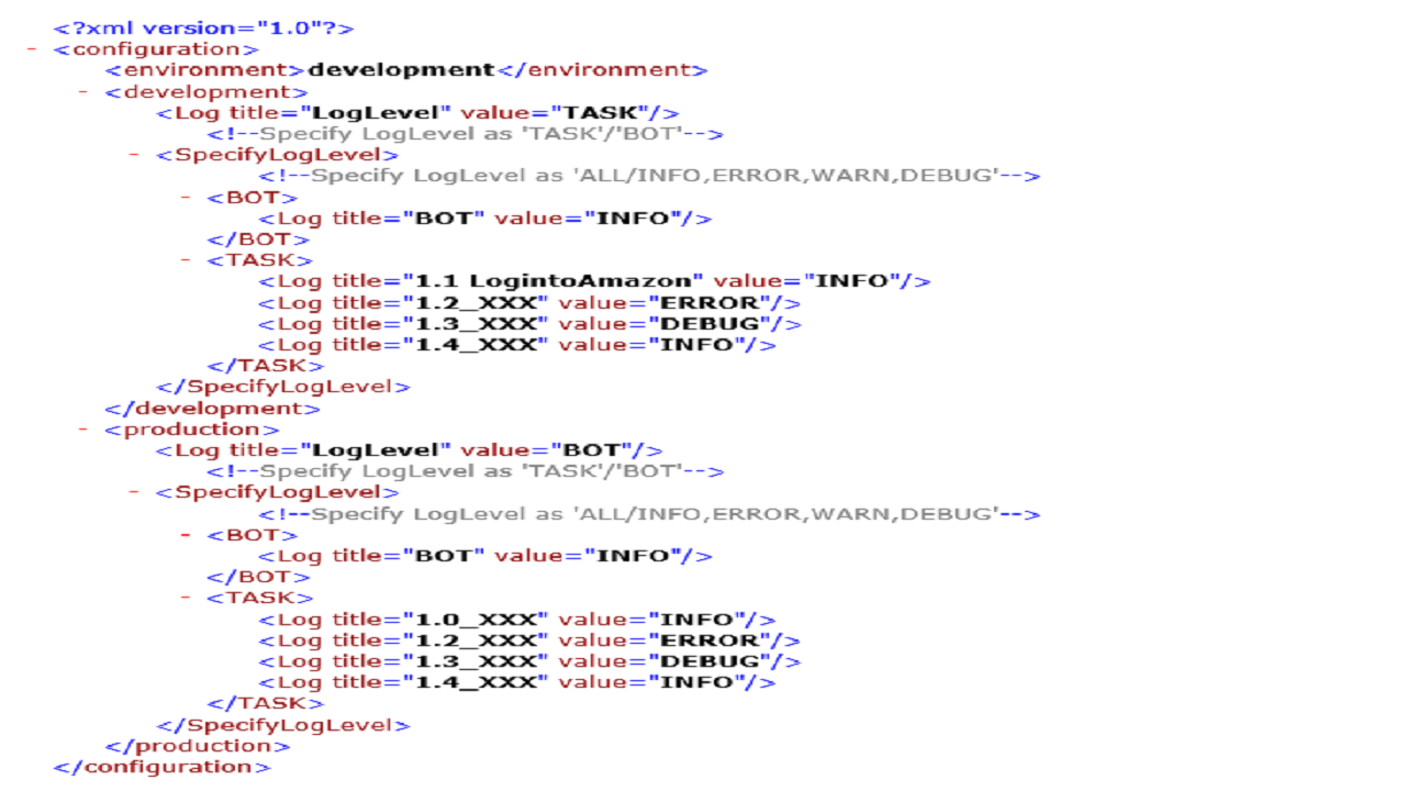 Solution: Logger Framework is a rich framework that enables you to run each bot in your process flow with a specified custom log level. This produces a beautiful log report(.csv) with all the details of the action performed/failure. It also helps you capture screenshots only at a required step with just a change in value.