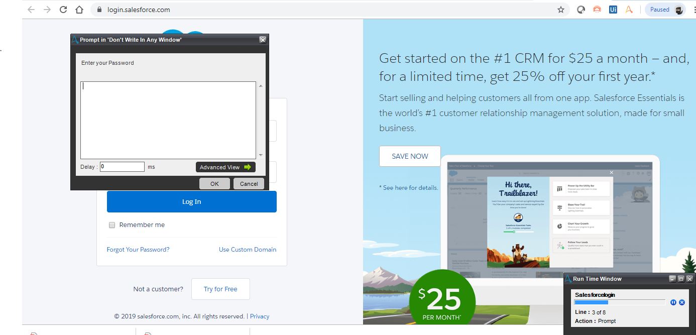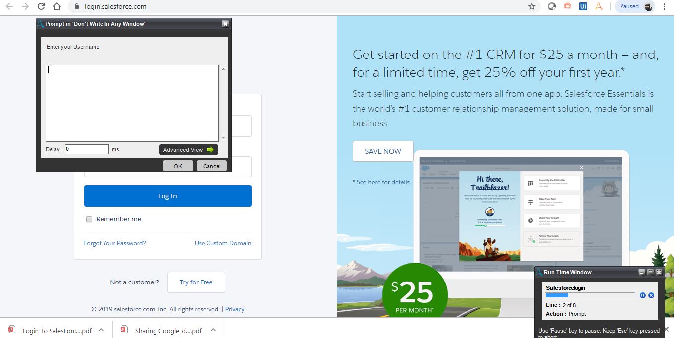 This bot will ask the user for their username and password using the prompt and will log the user into the Salesforce application.