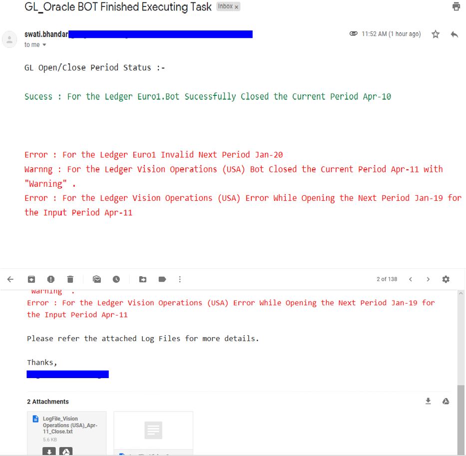 - Bot can close and open the period of a General Ledger application as required and eliminate manual efforts and human error.